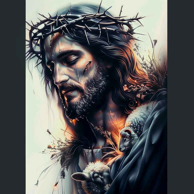 An AI-generated tattoo project, this design offers a realistic black-and-grey portrait of Jesus crowned with thorns, with a lamb resting near the heart. Subtle gradients and restrained line work sculpt lifelike skin, fabric, and texture, achieving a solemn, timeless feel. The crown of thorns is rendered with fine, jagged detail to convey ruggedness without overpowering the face, while the lamb is bathed in soft highlights to symbolize innocence, sacrifice, and the Lamb of God. The composition centers on the face and chest, inviting a calm, contemplative gaze and echoing the sacred partnership between Christ and mercy. Robes fall in layered tonal transitions, providing depth and rhythm while keeping the sacred icon at the forefront. This tattoo design speaks to faith and resilience, translating a biblical moment into wearable narrative that remains legible across scales—whether on forearm, chest, or back. The style leans toward classical religious iconography rendered in modern realism, compatible with both large canvases and intimate placements. Given the image’s deep contrasts, the piece is particularly well suited as a cover-up option for older tattoos, offering a dignified rebirth of body art while preserving meaningful symbolism. Note that this is an AI-generated tattoo project, intended as a sophisticated blueprint for a custom tattoo design, to be refined by an experienced artist in line weight, contrast, and skin-tone adaptation, ensuring longevity of the ink and clarity over time. In sum, it marries sacred symbolism with contemporary technique, yielding a meaningful tattoo design that honors Jesus and speaks to devotion through enduring black-and-grey realism.