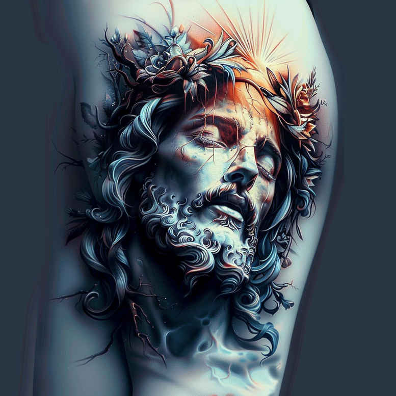 In this AI-generated tattoo project, a highly detailed Jesus portrait emerges in black and grey, with a solemn gaze, a crown of thorns, and flowing robes that melt into an ornate floral frame. The design uses layered shading, soft transitions, and fine line detailing to render lifelike skin texture, stubble, and the folds of fabric. A wreath of leaves and blossoms traces the outer edge, lending a timeless sacred aura while functioning as a built‑in pattern that adds rhythm and cohesion to the piece. Symbolically, the image conveys mercy, sacrifice, and redemption—the crown signaling suffering endured for humanity, the luminous eyes inviting contemplation, and the floral motif representing rebirth and renewal. The choice of black and grey creates a timeless, masculine contrast that pairs well with existing tattoos or scar cover, making it an excellent cover-up candidate for those seeking meaningful tattoos with a spiritual dimension. The piece demonstrates mastery of shading and contrast, using negative space to keep the face legible even in a heavily inked sleeve. For collectors, this tattoo design offers a realistic approach to religious iconography fused with botanical ornament, blending traditional Christian symbolism with contemporary body art forms. The reference to Jesus anchors the work in devotion, while the surrounding patterning provides movement and depth that can be scaled from a shoulder to a full sleeve. This is an ambitious, custom tattoo design that speaks to devotion, resilience, and faith in a visually compelling way. AI-generated status acknowledged, the piece is suitable for those pursuing a meaningful tattoo that stands the test of time. Keywords to consider include tattoo, tattoo design, meaningful tattoos, black and grey, realistic tattoo, custom tattoo design, flower tattoos, lotus flower tattoo, rose tattoo design, body art, ink.