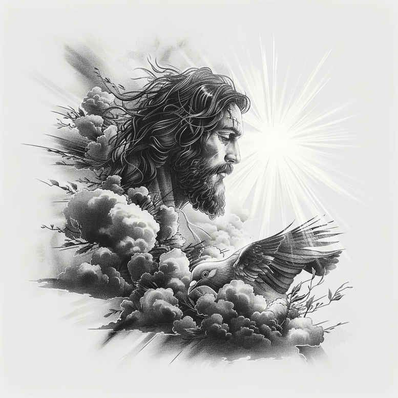 An evocative portrait of Jesus rises from cloud banks, a moment of divine calm captured in grayscale. The central figure’s face is rendered with soft contour shading, a beard and a serene gaze that invites reflection. A halo crowns the head, while rays of light radiate to the right, balancing the composition against the turbulent cloud swirls that frame the form. The robe gathers with subtle folds, giving weight and presence to the figure. The technique fuses realistic portraiture with atmospheric cloudwork, using black and grey ink to create depth, contrast, and a timeless, contemplative mood. The soft transitions between light and shadow, combined with a fine line approach to detail, lend a graphite-like realism that reads clearly from a distance yet rewards close inspection. Key elements in this design are Jesus, cloud, halo, ray, robe; together they compose a scene that can be placed on the chest or back as a strong focal point, or scaled for smaller areas as part of a larger composition. Symbolically, the image conveys divinity, mercy, guidance, and faith, with light piercing through the clouds to signify revelation and hope. For wearers seeking meaningful tattoos, this concept offers a spiritual portrait that pairs well with additional symbols such as a cross, dove, or scripture verse, or can stand alone as a singular sacred image in black and grey. The grayscale palette makes it versatile for both classic black and grey work and future color accents. In the broader context of tattoo art, this design sits at the crossroads of realistic portraiture, religious iconography, and timeless body art, appealing to those who value meaning and craftsmanship in a single inked piece. AI-generated tattoo projects were used to explore how a Jesus-in-clouds scene translates to skin, providing a blueprint for tattoo artists and clients alike to imagine this sacred moment in ink.