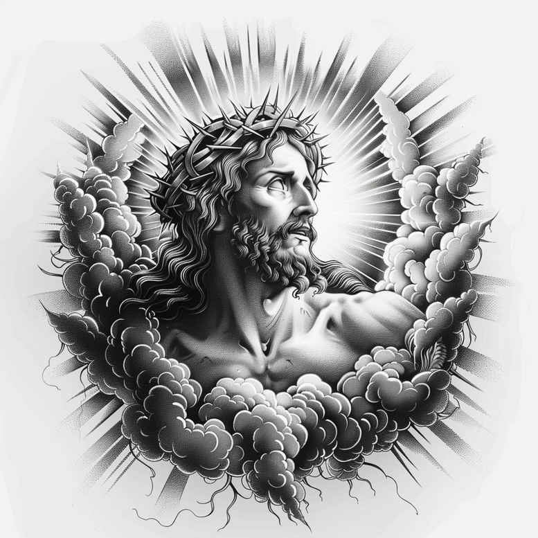 These AI-generated tattoo projects explore sacred imagery of Jesus in a dramatic grayscale composition. The central figure is Jesus, rendered with a serene, sorrowful expression, crowned with a thorn crown and halo that radiates outward in sharp, linear rays. He rises from a bed of rolling clouds, while bold light rays emphasize his presence as the King of kings. The shading builds volume and life through layered black and grey ink, with fine gradients that simulate skin, hair, and the rough texture of the crown. The crown of thorns anchors the piece in sacrifice and humility, while the halo and radiant light signify sanctity, blessing, and divine guidance. The surrounding atmosphere is a study in contrast: deep blacks deepen the composition against lighter, misty cloud forms, giving the figure a sculptural, almost bas-relief feel. The design reads as a meaningful tattoo design with spiritual resonance, appropriate for large areas such as the back, chest, or shoulder, where the composition can breathe and let negative space frame the sacred portrait. The heavy ink ensures strong visibility at distance while maintaining nuance up close, making it a powerful choice for a cover-up tattoo that can mask prior dark work while replacing it with a reverent, timeless image. As an AI-generated tattoo project, it demonstrates how digital concept art translates into ink-ready body art through deliberate attention to line weight, shading, and tonal balance. For collectors of meaningful tattoos, this depiction of Jesus blends classic religious iconography with modern realism, offering customization in scale, placement, and background texture, while preserving a strong narrative of faith, sacrifice, and hope. Keywords such as tattoo design, meaningful tattoos, black and grey, realistic tattoo, body art, ink, custom tattoo design, and sacred imagery are woven into the concept to improve visibility in a portfolio, magazine feature, or studio catalog.