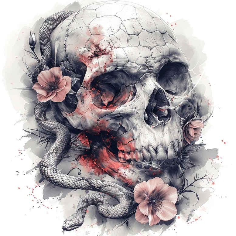 This concept presents a dark, watercolor-inspired tattoo design that centers a skull, a coiled serpent, and soft pink blossoms. Executed in black and grey, the piece relies on high-contrast shading to sculpt the skull’s cranium, eye sockets, and nasal cavity, while the serpent threads through the frame with tapered scales created by fine line work and subtle cross-hatching. The blossoms anchor the composition and provide a luminous counterpoint to the grayscale shading, balancing macabre mood with delicate feminine notes. A painterly wash dominates the background, with diffuse edges, splatters, and feathered transitions that evoke watercolor technique and allow the ink to breathe with the body’s contours. The overall effect reads as a study in life and death, resilience and peril, with flower symbolism amplifying renewal and memory. The design works on a bold back or chest piece, yet scales gracefully for a forearm or calf while preserving legibility. The composition emphasizes strong negative space around the skull, while the serpent and flowers create a dynamic flow that guides the eye along the limb. From a technique perspective, crisp line work frames the serpents contour, soft gradations shape the petals, and tonal balance keeps cohesion across scales. It also offers a robust cover-up option due to dense dark areas and layered textures that can obscure previous work. For tattoo enthusiasts, the concept invites adaptation: intensify the serpent, vary the floral palette, or add motifs such as lotus or infinity to tailor meaning. This is an AI-generated tattoo project; designers can further refine alignment, scale, and shading to suit anatomy and skin tone. In short, the piece fuses classic imagery with contemporary watercolor sensibility to deliver a versatile black and grey tattoo design with meaningful resonance and broad appeal.