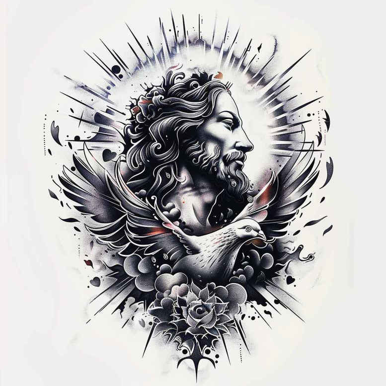 An AI-generated tattoo project reimagines sacred iconography through a contemporary ink language, merging devotion with bold graphic clarity. The centerpiece is a portrait of Jesus in black and grey realism, shown in profile to emphasize regal dignity, with a sacred heart resting over the chest as a luminous anchor of compassion and sacrifice. A halo encircles the head, its edges punctuated by radiant spikes that dissolve into abstract filigree, creating a dynamic silhouette against the skin. The composition uses fine line work to define facial features and drapery, while broad tonal shading builds volume and mood, giving the image the weight of a classical painting translated into body art. The surrounding motifs are geometric and floral whispers—pattern-like accents that echo church art without overpowering the main figure—so the piece reads as a cohesive whole rather than a patchwork of elements. The color scheme stays strictly black and grey, a choice that enhances longevity and readability on the skin, while enabling subtle gradients that mimic charcoal drawing. For the wearer, this design carries meanings of faith, endurance, kingship, mercy, and divine love—the sacred heart as mercy, the halo as sanctity, and the radiant rays as grace extending outward. The design is adaptable: it can scale for a chest or back piece or be simplified for a smaller tattoo, preserving the essence of Jesus as greatest king and the heart as emblem of compassion. Because the origin is AI-generated, the project offers a modern take on traditional religious imagery, appealing to fans of realistic tattoo, fine line tattoo, or custom tattoo design while staying rooted in timeless symbolism: sacred heart, devotion, forgiveness, and spiritual authority. The piece also nods to broader tattoo vocabularies—Japanese style tattoo and tribal tattoo influences emerge subtly through line weight and negative space—while remaining a strong black and grey, high-contrast design suitable for cover-up on very dark skin or older ink. If replacing or concealing existing work, the dense shading and layered line work provide excellent cover-up potential, letting the spiritual narrative shine anew. In short, this tattoo design invites the wearer to bear a narrative of faith with a bold, timeless aesthetic.