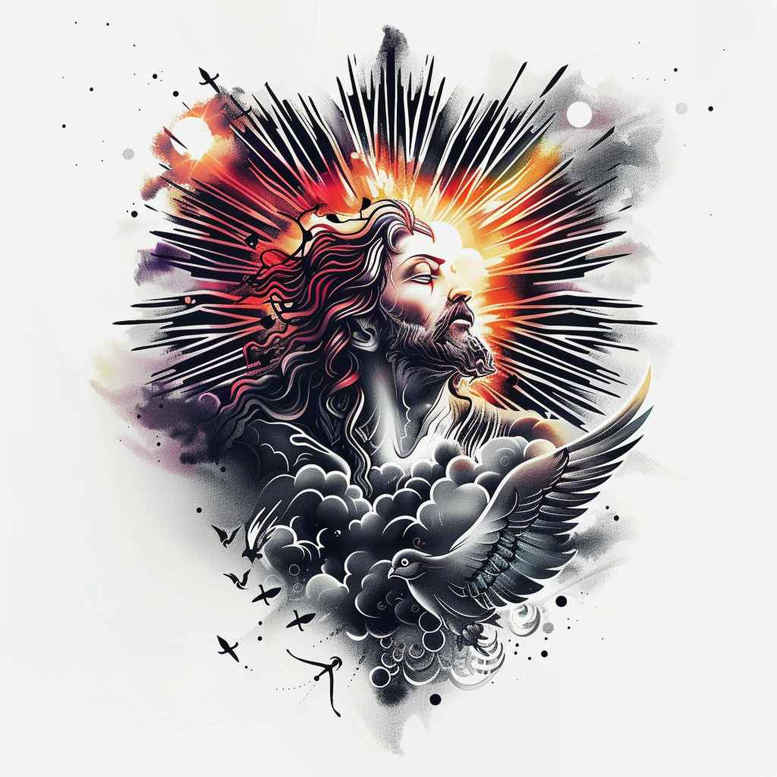 This AI-generated tattoo project translates a sacred vision into a refined black-and-grey composition. The central figure of Jesus Christ gazes outward beneath a radiant halo, his countenance calm yet majestic, while a crown woven with thornlike texture encircles his brow, signifying sacrifice and sovereignty. A pale sunburst blooms behind him, scattering light through the surrounding atmosphere and creating a dramatic interplay between illumination and shadow. Doves wheel and drift above the cloudscape, symbolizing the Holy Spirit, peace, and divine presence, while soft wind-swept lines suggest motion and breath in this still moment. The technique blends broad brushwork with fine line detailing: the halo and crown are rendered with crisp contours and subtle stippling, while the figure’s face is approached with delicate shading to convey reverence and humanity. The clouds serve as a tender backdrop, their edges dissolving into negative space to foreground the core icon. Executed in black and grey, the design relies on contrasts of deep graphite tones and lighter midtones to yield a timeless, realistic impression that suits both shoulder- and chest-placement as a meaningful tattoo design. For tattoo enthusiasts, the concept reads as a modern sacred portrait—an accessible, powerful image for meaning-seeking wearers who value traditional religious symbolism fused with contemporary craft. The composition supports a range of applications—from small tattoos to larger pieces—yet remains legible at smaller scales thanks to the bold silhouette of Jesus and the glow of the halo. As an AI-generated concept, it demonstrates how digital processes can inform custom tattoo design, offering a unique, personalized body art idea rooted in faith, resilience, and divine protection. Given the darker tonal range and the density of the black ink, the piece is particularly well-suited for cover-up work, where added shading can help conceal existing marks while preserving a focus on spiritual meaning and a striking focal point of hope. This concept embraces meaningful tattoos with a timeless sensibility, blending realism with symbolic elements to create a versatile, icon-driven piece suitable for ink lovers and collectors alike. It aligns with black-and-grey realism, remains adaptable to various placements, and stands as a testament to craft, faith, and personal narrative expressed through tattoo design, body art, and ink.