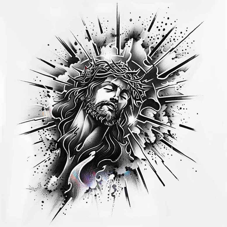 This black and grey Jesus portrait tattoo design centers on a reverent depiction of Christ, rendered with careful shading that yields a calm, luminous presence on the skin. The figure’s face is carved with soft transitions between deep blacks and cool greys, while a jagged crown of thorns encircles the brow as a solemn reminder of sacrifice. A radiant halo blooms behind the head, extending into sunburst lines that evoke divine mercy and guidance radiating outward. An ink-splatter texture around the figure adds movement and a contemporary edge, creating a dynamic, pattern-like frame that bridges traditional religious iconography with modern tattoo aesthetics. The composition relies on high contrast to convey volume, texture and flesh, making it adaptable for large placements such as the back, chest, or a bold centerpiece on the arm or shoulder. The symbolism is deliberate: Jesus as savior, the crown as suffering endured for humanity, the halo as illumination and truth, and the rays as protection and grace in daily life. Though rooted in sacred imagery, the piece fits within the broader conversations about meaningful tattoos and black and grey realism, and it can be executed in various styles from fine line to realistic shading, with potential Japanese style influences for a blended look. This is an AI-generated tattoo project, exploring how digital artistry translates sacred symbolism into wearable body art while maintaining reverence. For clients seeking a cover-up, the strong grayscale contrasts and radiating lines provide options to mask older ink effectively, making this design especially suitable as a cover-up-ready tattoo. In short, the Jesus-inspired composition embodies faith, resilience, and spiritual guidance, offering a timeless design for people who want a powerful symbol of devotion in their body art.