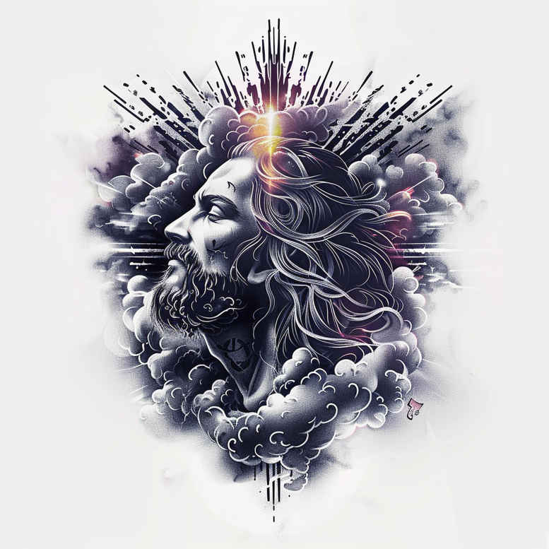 Rendered as a black and grey realism study, this Jesus portrait tattoo design centers a serene kingly presence, with a halo of radiant light that crowns the head and spills into the surrounding atmosphere. The face is carved with soft, precise shading that conveys calm authority and mercy, while the beard and hair are rendered with fine line work that gives texture without overpowering the composition. Behind the figure, a halo radiates outward, and stormy clouds drift in layered grayscale, creating dramatic contrast and a sense of depth that pulls the eye toward the sacred gaze. Subtle rays emerge from the halo, breaking through the clouds in a pattern-like cadence that evokes heavenly guidance. The whole piece embraces a modern tattoo vocabulary while honoring centuries of sacred iconography, balancing classical composition with contemporary execution. The color scheme remains black and grey to emphasize form, light, and shadow, allowing the subject to breathe across skin with realistic nuance and longevity. This design is a testament to meaning: Jesus as the greatest King, a symbol of divine authority and compassion; the halo as the crown of spiritual sovereignty; clouds as a veil through which revelation arrives. For tattoo enthusiasts, this concept translates into a powerful statement about faith and endurance in a format suitable for a larger canvas, yet adaptable to smaller panels if needed. In terms of technique, expect crisp line work on the facial features and hair, smooth gradient shading in the cheeks and jaw, and careful control of contrast to preserve readability as the tattoo ages. The pattern of radiating light adds rhythm and a sense of upward motion, making it a robust choice for those who seek a meaningful tattoo design that merges reverence with modern skin art. Because the image is richly shaded and dark in tone, it is especially well-suited for a cover-up, offering a generous field to conceal older markings while integrating the sacred imagery into a cohesive, graceful flow. AI origin note: this is an AI-generated tattoo project designed to explore the intersection of sacred imagery and contemporary tattoo technique, a research-friendly concept for clients who desire a bold, timeless representation of Jesus, divine light, and eternal hope in a black and grey palette. Placement ideas include the chest, back, or sleeve, where the interplay of light and shadow can be emphasized, and the image can scale gracefully for larger canvases. Keywords: tattoo, tattoo design, meaningful tattoos, fine line tattoo, black and grey, realistic tattoo, body art, ink.