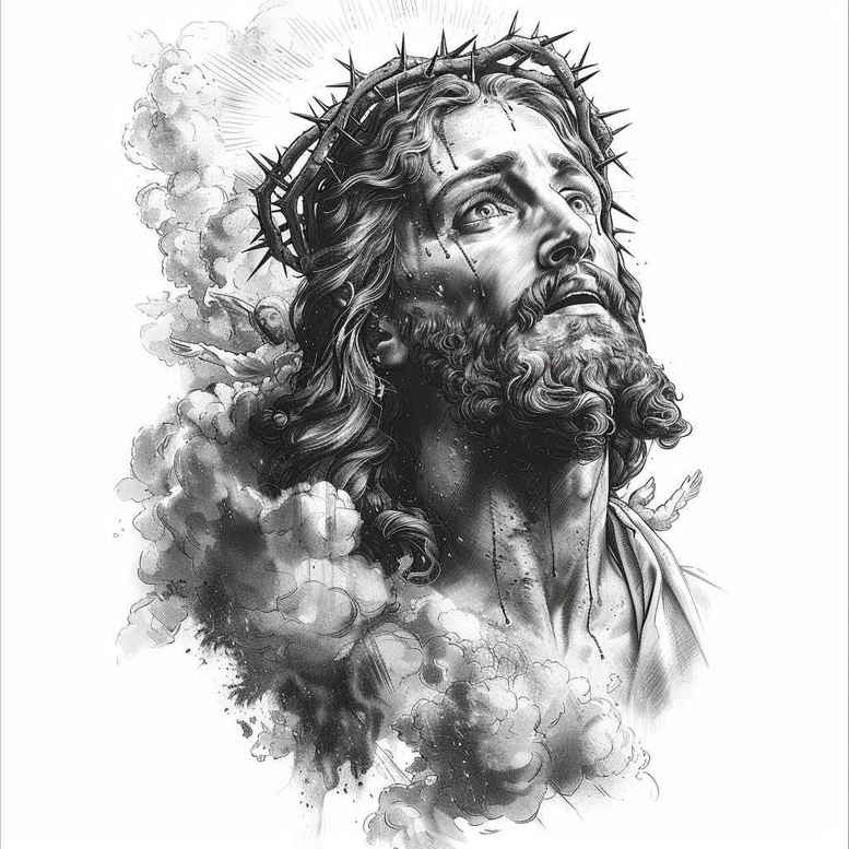 These AI-generated tattoo projects explore devotion through a solemn Jesus portrait rendered in black and grey realism. The composition centers on Jesus’ face, eyes raised in quiet mercy, with a crown of thorns encircling the brow and a beard and hair rendered in meticulous shading that recalls classic religious iconography. Smoke and cloud shading envelop the head, providing a soft halo-like aura without overpowering the realism. The crown of thorns is depicted with rugged detail, each thorn a symbol of sacrifice and endurance, while the surrounding shading uses gradual transitions to create depth and breath within the portrait. As a tattoo design, the piece communicates meaning through sacrifice, redemption, and compassion—elements that resonate in many meaningful tattoos. The techniques combine fine line precision for the strands and subtle cross-hatching for the darker planes, achieving a photorealistic feel in black and grey that remains durable over time. The result is a versatile image that can be placed on the upper arm, chest, or back, and scaled to suit different body contours while preserving the integrity of the facial features and crown. For collectors of custom tattoo design, this piece demonstrates how AI-generated ink can deliver a powerful narrative with strong contrast and texture, suitable for a cover-up due to its dense grayscale. It also opens possibilities for extension with additional symbols such as a dove or scripture ribbons in a larger sleeve, maintaining the same devotional mood. Ultimately, this piece stands as a testament to faith-inspired body art and the potential of AI-generated tattoo projects to offer deeply personal, enduring imagery.