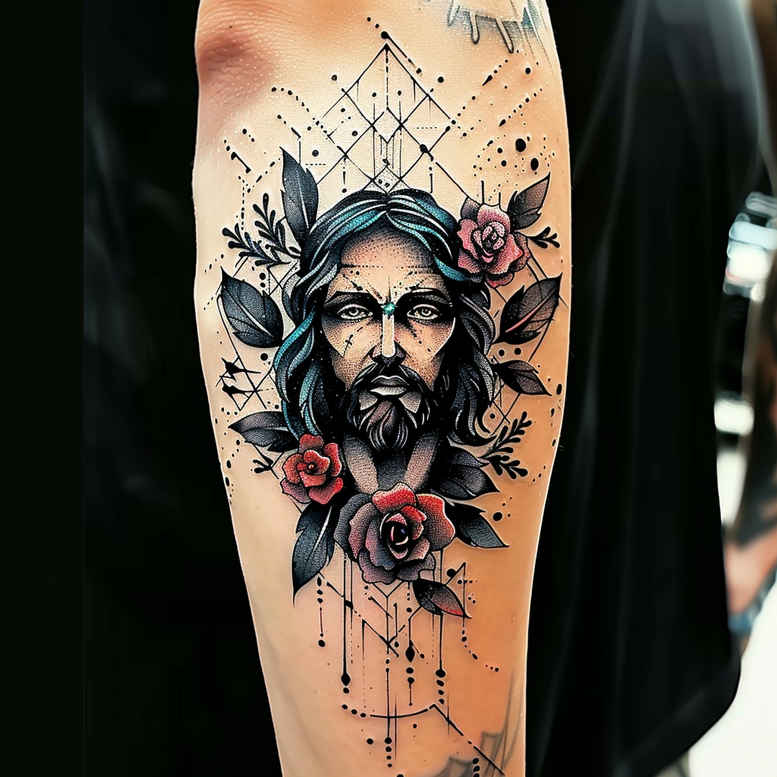An AI-generated tattoo concept centered on a lifelike Jesus portrait rendered in black and grey realism. The face carries measured shading and soft transitions that convey a somber, reverent gaze, while a geometric halo of interlocking diamonds sits above, its lines cascading into a delicate lattice around the head. Crimson roses weave into the composition, their color used sparingly to punctuate the monochrome study and symbolize devotion, sacrifice, and lasting love. The juxtaposition of sacred realism with geometric geometry creates a contemporary take on iconography, inviting reflection on faith’s endurance in daily life. The fine line work of the halo contrasts with broader shading on the cheeks and beard, producing depth and luminosity that read well on skin. The entire design is arranged to follow the arm’s contours, with a vertical alignment that makes the halo a focal point while leaving room for extension into a sleeve if desired. From a tattoo design perspective, this concept embraces realistic black and grey technique, precise dotwork, and pattern-driven geometry to craft a meaningful tattoo that remains timeless. It sits comfortably within black and grey realism, rose tattoo design, and fine line tattoo aesthetics, while staying true to Christian symbolism and the figure of Jesus Christ. As an AI-generated tattoo project, it invites collaboration with an illustrator to translate the subtle tonal shifts into durable, long-lasting ink. In short, this design blends devotion with modern craft, offering a refined option for those seeking a powerful yet contemplative body art piece.