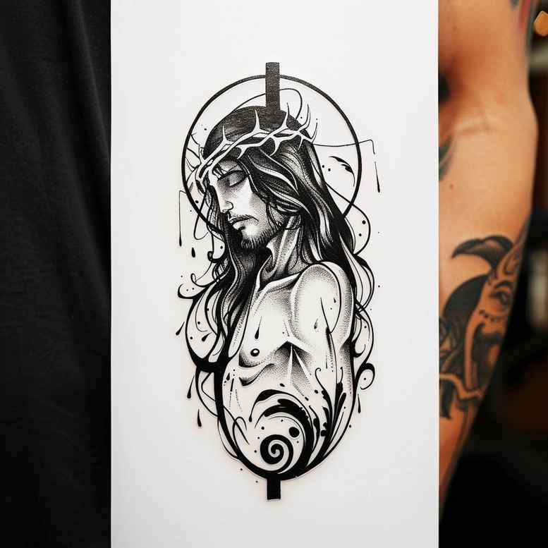 An AI-generated tattoo project, this design presents a sacred Jesus figure rendered in precise fine-line black-and-grey on a pale canvas. The central figure is depicted with a serene expression and flowing hair, anchored by a halo that crowns the head and grounds the composition inside an elegant oval frame. A slender cross motif rests at the base, echoing timeless Christian iconography, while curling filigree and controlled negative space create a delicate rhythm that guides the eye along the contours of the figure and frame. The meaning centers on divine protection, mercy, and eternal life: the halo denotes sanctity, the cross stands for redemption, and the circular enclosure signifies infinity and unity with the divine. Executed with meticulous line work and restrained shading, the piece embodies modern tattoo design sensibilities without sacrificing traditional symbolism. The black-and-grey palette lends a timeless quality, suitable for a range of placements from upper arm to back, and the line density allows for subtle adjustments in scale. This tattoo design speaks to meaningful tattoos for believers seeking a personal emblem that honors Jesus Christ while remaining visually versatile. For collectors of fine line tattoos, this piece offers a refined, wearable homage to sacred art, with potential for a cover-up if desired. The pattern-inspired halo and frame enrich the composition with decorative rhythm, echoing both spiritual iconography and classical religious art. In summary, this custom tattoo design blends spiritual meaning with contemporary technique, a soulful expression in ink that can be admired as body art, a lasting memorial, or a daily reminder of faith. Shading uses subtle stippling to suggest depth in the halo and hair, enhancing the lifelike presence. The design adapts gracefully to varying skin tones and ages well, making it a timeless choice for a meaningful tattoo. It pairs well with other religious or floral elements for larger sleeves or back pieces, while remaining legible as a standalone emblem.