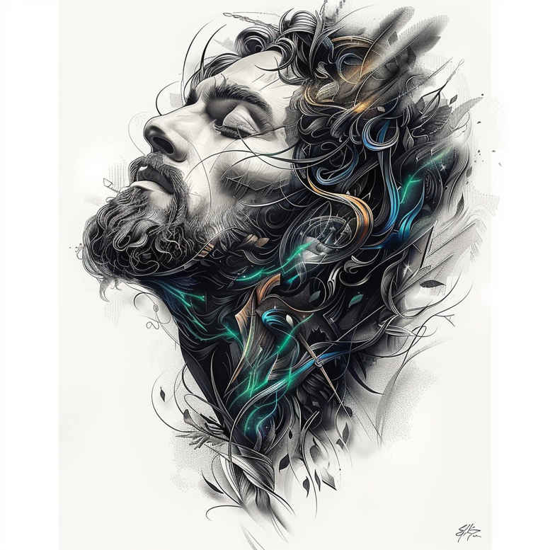 AI-generated tattoo projects exploring a Jesus portrait rendered in black and grey with teal accents. This highly tonal study emphasizes mercy and sacrifice through a refined blend of realism and expressive linework. The subject’s face is captured in a moment of serene contemplation, eyes closed, brow furrowed, mouth slightly parted, suggesting sacred compassion. The shading builds depth across the cheek and jaw, while hair and beard unwind into wisps that merge with dynamic, swirling linework. The turquoise highlights play across the contours, hinting at life and renewal amid the monochrome, a modern touch that adds a spiritual glow without overpowering the composition. Because the image is overall dark and dense, the design is particularly well-suited for a cover-up, capable of concealing previous ink underneath while delivering a bold religious centerpiece. The piece uses a fine line approach to create micro-detail in the hair, beard, and textures of skin, complemented by broad black shadows to achieve contrast. The symbolism is deliberate: mercy, sacrifice, and divine light; the viewer is invited to reflect on faith, hope, and redemption. Ideal as a tattoo design for meaningful tattoos, it works as a stand-alone portrait or a starting point for a larger sleeve, migrating from black and grey realism to a more stylized interpretation if desired. The art leverages techniques suited for a realistic or fine line tattoo, ensuring longevity and fidelity on skin. This is an AI-generated tattoo project, a modern exploration of sacred portraiture, and the pattern-like linework adds texture and motion, enhancing the piece’s visual rhythm. In sum, this Jesus-themed tattoo design marries reverence with contemporary technique, offering a cover-up friendly canvas that remains timeless and spiritually resonant in black and grey ink with subtle teal accents. For placement, consider shoulder, chest, or upper arm to maximize the interplay of light and shadow, and consult a skilled artist to adapt the scale while preserving the sacred mood of the design.