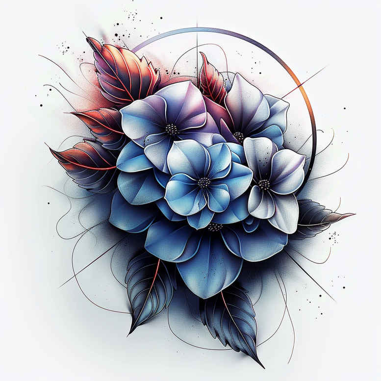 AI-generated tattoo project concept featuring a blue lotus flower surrounded by geometric rings and sketchy linework. The central bloom is built from overlapping petals in gradients of ultramarine to cerulean, with soft white highlights to mimic reflected light. Behind the blossom, stylized leaves provide contrast, while circular rings weave around the petals, creating motion and structure. The design merges painterly watercolor washes with precise fine-line outlines, delivering legibility at small sizes and richness at larger scales. The color strategy leans toward full-color ink, anchored by dark outlines to ensure durability and contrast on various skin tones. Symbolically, the lotus represents purity, resilience, and spiritual growth, making this tattoo design meaningful for personal milestones. The geometric rings evoke balance and continuity, while the organic leaf forms soften the geometry for harmony. This concept adapts to placements from forearm to shoulder and can be expanded into a Japanese-style tattoo or a graphic black-and-grey rendition, depending on the client’s vision. For artists, the piece offers clear guidelines: crisp outlines, layered washes, and a scalable structure that holds up under aging and sun exposure. As an AI-generated tattoo project, it provides a strong basis for a custom tattoo design that can be tailored to individual meaning, skin tone, and placement, with room for additional motifs such as infinity symbols or extra florals.