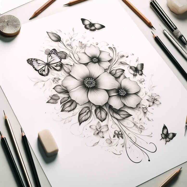 This AI-generated tattoo project concept presents a refined floral linework composition anchored by a bold central bloom, with curling leaves and delicate tendrils. Rendered in black and grey, the piece relies on clean contours, restrained shading, and intentional negative space to preserve legibility on small placements while offering depth for larger applications. The central flower acts as a clear focus, its symmetrically arranged petals balanced by surrounding foliage that creates rhythm, motion, and harmony across the skin. Butterflies hover around the blossom, injecting life and symbolism – transformation, resilience, and fleeting beauty – while the tendrils weave through the composition for subtle connective energy. The overall mood is timeless and versatile, suitable as a standalone tattoo or as the anchor for a broader botanical sleeve. Designers can adapt line weight and shading to produce a fine line tattoo or push toward a more realistic black and grey render, enabling references to Japanese style tattoo or contemporary minimalism. The concept welcomes personalization: adding a lotus motif, a small infinity symbol, or a discreet tribal element can tailor it to personal meaning while preserving readability. Because this is an AI-generated concept, it offers a productive starting point for collaboration between artist and client, whether for small tattoos, medium pieces, or larger body art that remains elegant and legible. The description highlights practical aspects for ink, including placement options and scaling, and it weaves in SEO-friendly keywords such as tattoo, tattoo design, meaningful tattoos, fine line tattoo, black and grey, flower tattoos, and custom tattoo design. In short, the design balances artistry and versatility, serving as a strong foundation for a meaningful tattoo project that can be refined into a standout piece.