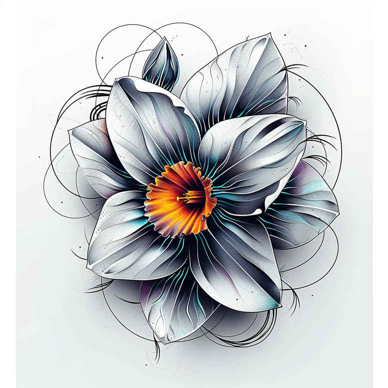 This description accompanies an AI-generated tattoo project conceived as a refined floral study. The concept presents a single bloom rendered in a disciplined fine-line approach, with white petals that display subtle blue-gray shading and a warm orange center that anchors the composition. The result reads as a delicate, realistic floral tattoo design that balances precision line work with airy negative space, yielding a piece that is at once graphic and elegant. Surrounding the blossom are circular loops and light circuitry-like curves that provide a subtle geometric pattern without overwhelming the natural form. The interplay between solid grayscale shading and crisp contour lines evokes black and grey realism while maintaining a modern, contemporary edge. Symbolically, the flower often represents renewal and beauty, while the circular motifs can symbolize infinity or continuity, allowing the design to function as a meaningful tattoo for personal growth, memory, or tribute. Technique-wise, the piece leans on fine-line tattoo fundamentals: clean line work, controlled shading, and careful tonal gradation to achieve depth within a compact footprint. The color accents are deliberately restrained, with the orange center acting as a focal point against a monochrome palette that is easy to adapt for small tattoos or larger translations across the body. This concept is suitable for custom tattoo design workflows, offering flexibility for placement on the wrist, forearm, shoulder, or collarbone, and can be expanded into additional floral or pattern motifs if desired. As an AI-generated tattoo project, it serves as an explorative concept for clients and artists alike, illustrating how abstract line art can carry symbolic meaning while remaining versatile for Japanese style tattoo inflections, infinity-themed narratives, or classic flower tattoos like lotus or rose studies. In short, this flower design merges elegance with technical clarity, inviting exploration into nuanced black-and-grey realism with a touch of color that keeps the composition lively yet timeless: tattoo, tattoo design, meaningful tattoos, fine line tattoo, lotus flower tattoo, infinity tattoo, tribal tattoo, rose tattoo design, small tattoos, flower tattoos, custom tattoo design, Japanese style tattoo, black and grey, realistic tattoo, body art, ink.