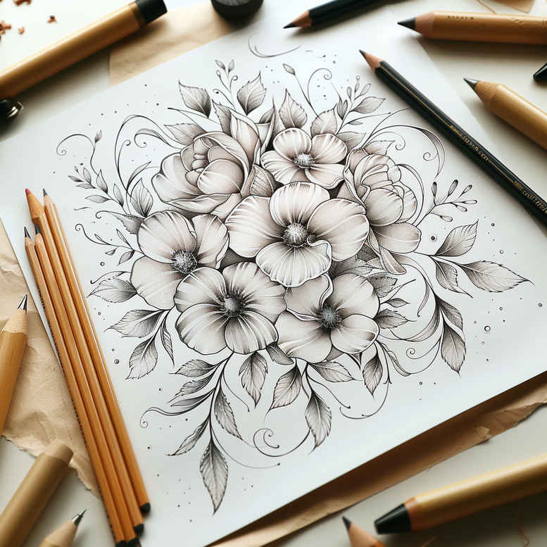 This is an AI-generated tattoo project concept focusing on a floral bouquet rendered in black and grey fine-line linework. The central motif is a cluster of blooms with delicate petals and slender leaves, sketched in graphite-like pencil on a white page, surrounded by the suggestion of drawing tools to emphasize its concept stage. Designed as a precise study, the piece relies on clean contours, subtle shading, and generous negative space to ease scaling from a small tattoo to a larger composition. Though depicted as a pure line study, the bouquet can be adapted into various tattoo design styles, from classic black and grey to subtle realism, and can incorporate motifs such as a lotus flower tattoo or a single rose tattoo design for symbolic meaning. The arrangement offers flexibility for placement on the forearm, shoulder, or ankle, and remains faithful to the fine-line tattoo aesthetic—thin, crisp lines with restrained shading that read clearly with age. For meaning, floral tattoos symbolize growth, renewal, and beauty, while leaves add movement and balance to the composition. The design also invites customization: adding a faint infinity tattoo motif along a stem, integrating small blossoms into a larger botanical sleeve, or pairing it with Japanese style floral elements for context and depth. As a piece of body art, the emphasis is on line quality, proportion, and readability in black and grey ink, ensuring a timeless result. This is a clear example of how AI-generated tattoo projects can inform traditional practice, offering a cohesive concept that translates smoothly into tattoo design, small tattoos, or extended body art without losing the elegance of fine-line work.