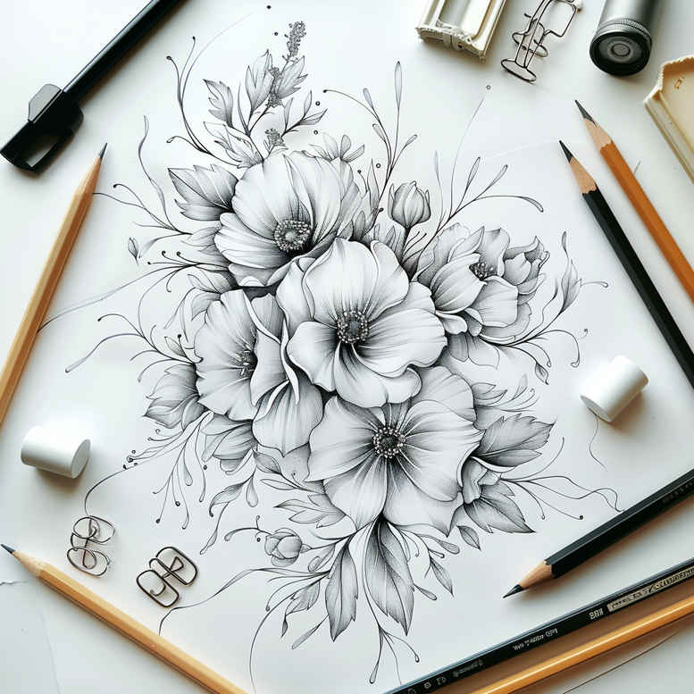 This floral study translates a bouquet into a refined tattoo concept, executed in a precise fine line style with black and grey ink. The composition centers on large layered petals, with delicate shading achieved through fine hatch marks and crisp outlines that retain legibility at small sizes. Set on a notebook page, the study is framed by studio tools—pencils, eraser, brush, and an ink bottle—emphasizing its origin as an idea for ink. The primary motif is versatile: flowers can evolve into a rose tattoo design or lotus flower tattoo, or be expanded into infinity or tribal motifs depending on the wearer’s symbolism. The technique emphasizes control of line weight and negative space to create depth without heavy fill, yielding a realistic tattoo aesthetic suited for body art lovers who favor subtle, enduring pieces. This design works well as a stand-alone small tattoo or as a centerpiece in a larger composition, and it can be adapted to Japanese style tattoo influences while preserving the clean, monochrome look. As a custom tattoo design, the line work reads clearly on skin, with room for personal detailing such as petals’ orientation, stem curvature, and background shading. In terms of process, the pencil sketch demonstrates planning and precision that translates into a durable final ink piece; the black and grey palette ensures timeless contrast and longevity. If the client desires, the concept can be refined into a full sleeve or kept as a delicate forearm piece while maintaining the original airy feel.