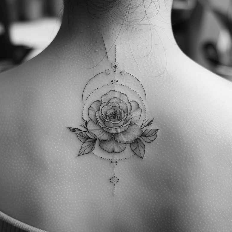 This black-and-grey fine-line tattoo concept places a detailed rose at the center of the upper back, framed by a circular mandala and a subtle vertical axis that guides the eye along the spine. The rose is rendered with crisp outlines and soft shading to convey velvety petals, while the surrounding circle reads as a delicate geometric pattern that adds symmetry and a contemplative mood. A slim central line bisects the composition, creating a quiet axis that unifies floral and geometric elements and gives the piece a timeless, wearable balance. Executed in black and grey ink, the design relies on contrasts between dark shadows and pale highlights, allowing clean negative space to breathe between petals and between the petals and the mandala lattice. This approach is ideal for fans of fine line tattoo technique who value clarity, longevity, and subtle depth, and it adapts well for small tattoos or larger back work. The concept also leans into a Japanese style sensibility, weaving natural forms with precise geometry in a way that remains distinctly modern rather than nostalgic. Symbolically, the rose embodies love, growth, and resilience, while the mandala represents wholeness and the infinite; together they narrate personal transformation, balance, and intention. As an AI-generated tattoo project, it showcases how digital pre-visualization can inform spacing, line weight, shading, and pattern density before committing to ink in a real studio, and it offers a practical path toward a powerful cover-up for older designs thanks to its dense black shading and strong silhouette. In practice, designers can tweak the circle into a lotus pattern or introduce subtle infinity cues to suit individual meaning, while clients seeking meaningful tattoos can appreciate the motif’s classic appeal, adaptable geometry, and the crisp, enduring aesthetic of a quality black and grey tattoo design.