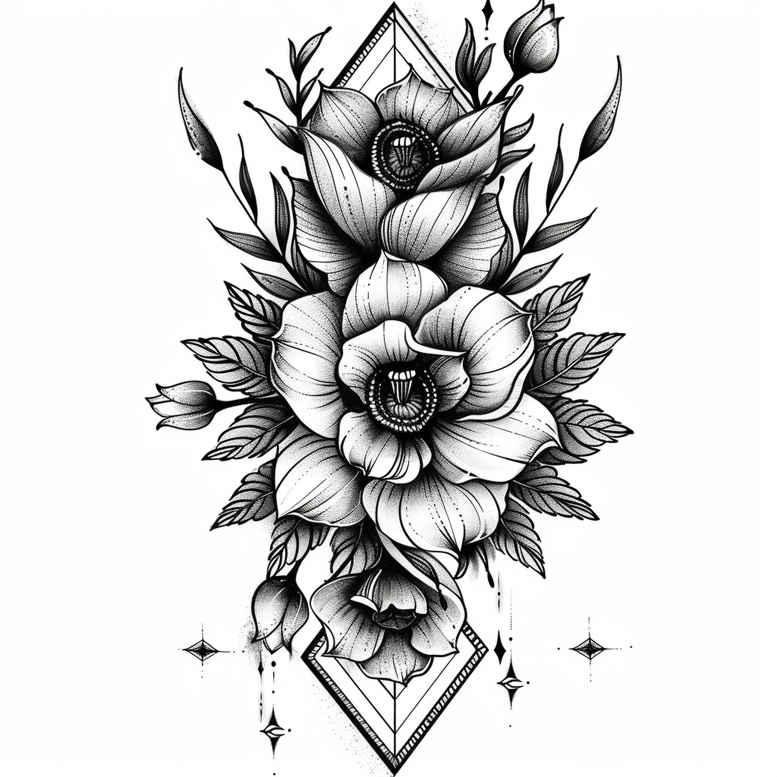 This AI-generated tattoo project concept presents a vertically oriented design that fuses floral realism with geometric precision. A blooming rose, rendered with layered petals and fine-line shading, rises above a stylized diamond motif that anchors the composition. Surrounding elements include a small bud, a few leaves, and subtle star-like accents, all created in stark black and grey ink to emphasize contrast. The result is a pattern-driven study in balance, where organic form meets geometric order, a pairing that suits meaningful tattoos and classic rose tattoo design alike. Symbolically, the rose stands for growth and passion, while the diamond suggests clarity, durability, and focus; together they evoke transformation and resilience, making this a versatile concept for both personal expression and tattoo storytelling. The technique favors precision linework, light shading, and smooth gradients to achieve depth without over-saturation, allowing it to scale gracefully from small forearm placements to larger canvases. The concept invites customization: artists can adjust petal veining, tweak the diamond facets, or weave in additional motifs such as Japanese-style line details or infinity symbols, all while preserving the black and grey palette and the clean, timeless look. As a modern AI-origin project, it demonstrates how digital concepts can translate into refined tattoo design ideas that feel both contemporary and enduring, a strong foundation for custom tattoo design, flower tattoos, and fine-line tattoo portfolios.