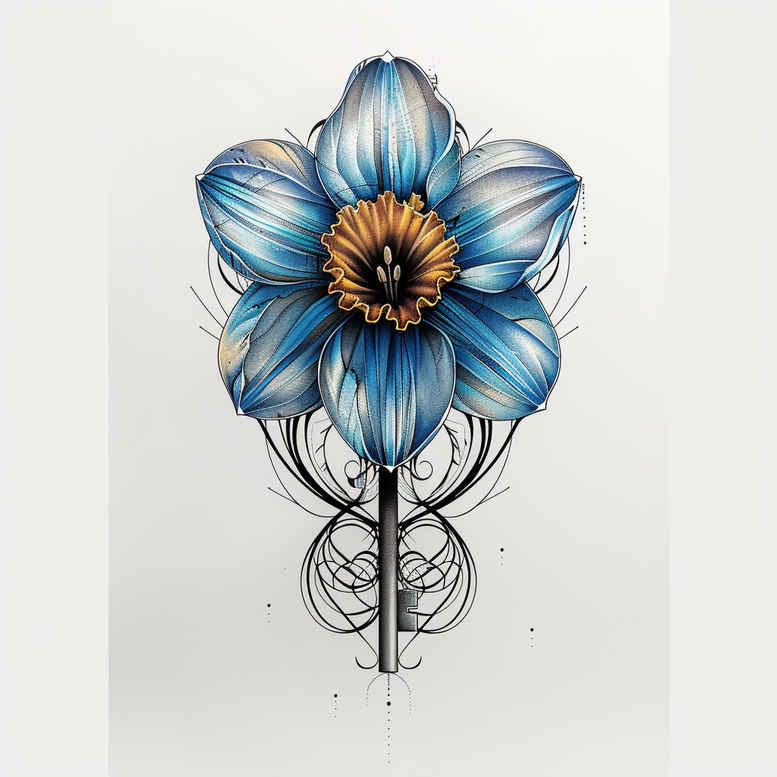 This AI-generated tattoo project presents a blue lotus flower rendered in color, anchored by a precise black linework stem and an ornamental circular swirl at the base. The composition pairs fine line technique with painterly watercolor shading to create a luminous bloom that remains legible at small scales. The central lotus symbolizes purity and renewal, while the stem and looping motifs evoke infinity and continuity, suggesting growth kept in balance with restraint. The blue petals are enriched by gentle gradients and crisp outlines that contrast with the darker, geometric base, delivering a dynamic yet harmonious tattoo design. Though primarily color, the design retains a strong graphic edge suitable for longevity on skin, a feature that makes it a practical option for small tattoos or as a starting motif for a larger piece such as a sleeve. Its clean geometry nods to Japanese style tattoo aesthetics, yet it stays contemporary through its decorative pattern and botanical focus, making it adaptable to different placements: forearm, shoulder, or calf. From a technique perspective, the piece blends fine line precision with soft color wash, creating depth within a minimalist frame—a hallmark of modern tattoo design and an appealing route for meaningful tattoos. If you’re exploring themes of growth, resilience, and natural beauty, this lotus-focused concept serves as a versatile foundation for custom tattoo design and flower tattoos in color or black and grey variants. While this is an AI-generated tattoo project, the concept emphasizes clear lines, negative space, and a balanced composition that can be tailored to individual preferences.