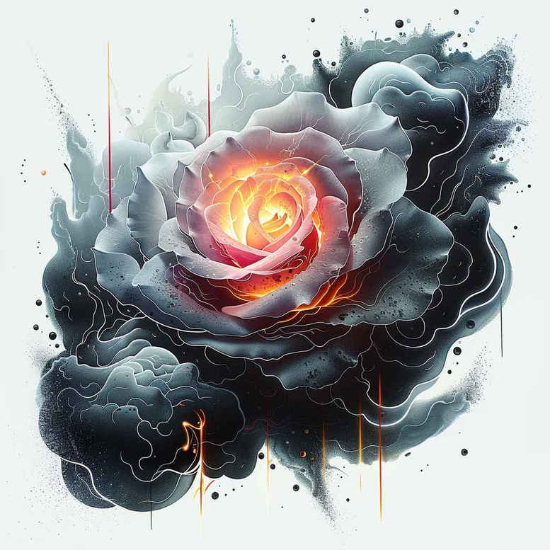 This is an AI-generated tattoo project concept presenting a dark rose motif intended for cover-up applications. At the heart of the design sits a luminous orange glow emerging from tightly inked rose petals, while the surrounding petals and sepals are rendered in black and grey with meticulous shading. A smoky, pattern-like background frames the bloom, creating a dramatic contrast that helps conceal underlying work yet preserves intricate detail. The composition emphasizes a realistic rose texture through fine line shading, soft gradient transitions, and controlled stenciling that ensures readability on the skin. The main elements—rose, petals, glow, smoke, background—are arranged to form a bold silhouette suitable for larger placements or scaled down for smaller tattoos. The piece embraces traditional rose symbolism—love, resilience, renewal—while leveraging modern tattoo techniques: black and grey realism, smooth transitions, and selective color pickup in the center to draw attention without overwhelming the grayscale. It is a strong candidate for a custom tattoo design in Japanese or contemporary styles, and it can be adapted to tribal tattoo motifs or floral sleeves depending on client needs. The AI-generated concept serves as inspiration for real-world ink, a starting point for a meaningful tattoos collection that can be refined by an artist into a final design; it is compatible with fine line tattoo approaches and can be integrated with lotus flower tattoo or infinity tattoo elements if desired. Given its overall darkness and density, the concept is explicitly positioned as a cover-up solution, and its bold center glow helps mask prior ink while maintaining a striking, timeless aesthetic. This project illustrates how black and grey ink, realistic tattoo rendering, and a controlled color accent can produce a powerful, durable body art piece that resonates as both a standalone artwork and a versatile foundation for future tattoo design explorations.