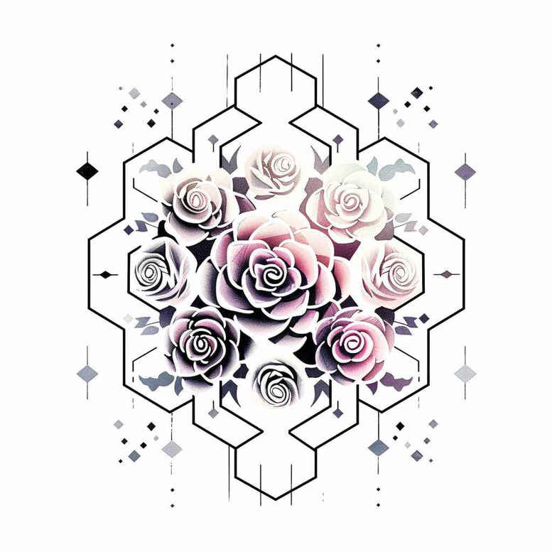 This AI-generated tattoo project concept presents a restrained geometric floral composition that blends delicate realism with modern geometry. The centerpiece is a cluster of roses rendered in soft pinks with subtle grey shading, their petals layered to create depth against a hexagonal honeycomb grid that frames the bouquet. Clean black outlines define the shapes while fine line work and careful shading give the petals a tactile, living quality. The hex pattern functions as a contemporary backdrop, providing structure and rhythm without overpowering the floral focus. The color palette remains light and refined, inviting skin tones to emerge through the ink, with gradients that enhance form without heavy saturation. The design offers placement versatility on forearm, upper arm, calf, or back and can be adapted into a larger sleeve concept or a small tattoo. Symbolically, roses convey love, passion, and renewal, while the geometric lattice suggests balance, order, and the intersection of nature with design. The composition suits meaningful tattoos that commemorate a milestone or tribute, and benefits from refined Japanese style line work, crisp geometry, and modern aesthetics. From a technique standpoint, this concept embraces fine line tattoo artistry, precise line work, subtle shading, and purposeful negative space. It is suitable for color rendition or conversion to black and grey ink, depending on client preference. This is an AI-generated tattoo project concept, illustrating how algorithmic geometry can elevate a traditional floral motif into a distinctive piece of body art. Keywords include tattoo, tattoo design, meaningful tattoos, fine line tattoo, lotus flower tattoo, infinity tattoo, tribal tattoo, rose tattoo design, small tattoos, flower tattoos, custom tattoo design, Japanese style tattoo, black and grey, realistic tattoo, body art, ink.