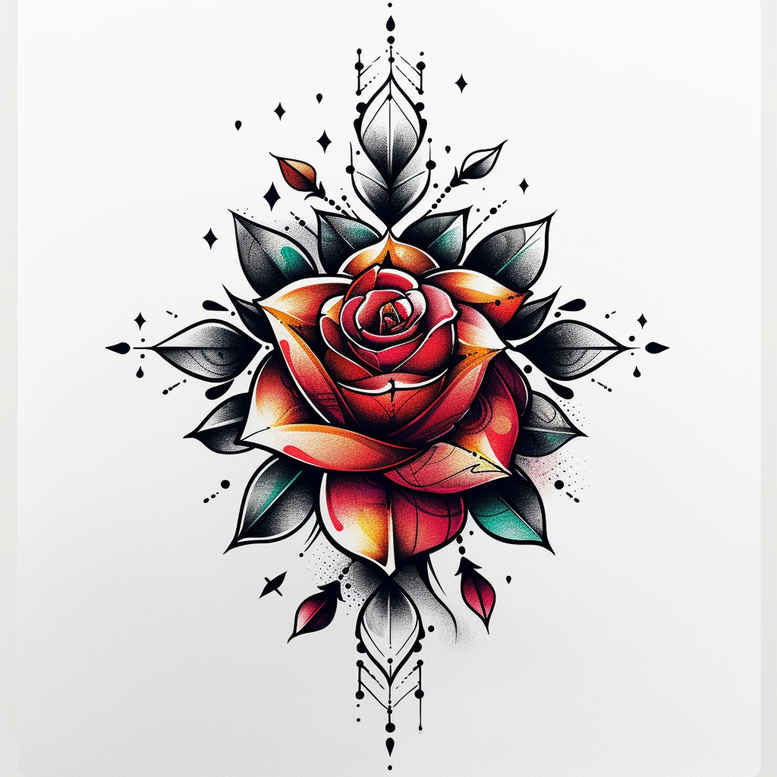An vibrant rose tattoo design centers this composition, with crimson and pink petals, crisp black outlines, and subtle gradient shading that lends a lifelike bloom. A lush cluster of green leaves provides contrast while framing the blossom. Behind and around the rose, a black geometric mandala pattern radiates with precise line work, creating a contemporary fusion of botanical realism and graphic symmetry. The color palette emphasizes vivid rose tones against the stark geometry, allowing the piece to read clearly on lighter skin and scale gracefully from small tattoos to larger placements such as the forearm, shoulder, or back. Technique-wise, the piece blends smooth color gradients in the petals with fine line detailing and dot shading within the mandala to add depth and texture. Symbolically, the rose embodies love, growth, and resilience, while the mandala signals balance and focus; together they form a meaningful tattoo design that resonates on multiple levels. From a stylistic standpoint, this composition sits at the intersection of fine line tattoo and geometric floral motifs, offering a versatile option for a custom tattoo design that can be rendered in color or adapted to black and grey if requested. It aligns with trends in Japanese style tattoo and contemporary body art, appealing to collectors of flower tattoos and those seeking a vibrant, eye-catching piece. Although the image presents a bright, color-forward look, it remains suitable for a variety of placements and can be expanded into a larger sleeve or back piece if desired. While not inherently a cover-up by design, the adaptable geometry can be leveraged to conceal existing markings with the collaboration of an experienced artist. This description embeds search-friendly terms such as tattoo, tattoo design, meaningful tattoos, fine line tattoo, rose tattoo design, small tattoos, flower tattoos, custom tattoo design, Japanese style tattoo, black and grey, realistic tattoo, and ink to help discoverability in a crowded market of body art.