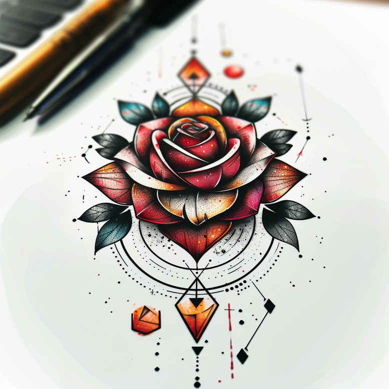 AI-generated tattoo project concept presents a rose tattoo design that blends fine line detail with a geometric mandala pattern. The central rose is rendered in saturated reds with subtle black outlines, anchored by emerald-green leaves that frame the bloom. A circular mandala surrounds the bouquet, constructed with precise line work, stippling, and delicate arcs to create a balanced, hypnotic focal point. Dangling diamond gems in warm amber hues descend from the lower edge, adding movement and a decorative fringe while preserving clarity in color and grayscale. The piece works well as color tattoo design or as a black and grey rendition, ensuring readability across sizes. The style merges fine line tattoo aesthetics with a restrained Japanese style of balance and flow, yielding a versatile concept for custom tattoo design on the shoulder, arm, or back. Technically, the design relies on crisp line work for the mandala, clean outlines around the petals, and subtle shading to give depth to the petals and leaves. The geometric patterning is bold enough to retain legibility when scaled down, yet intricate enough to reward close inspection. Symbolically, the rose stands for love and renewal, while the diamonds symbolize clarity and resilience; together they tell a personal story of growth and resolve. While rooted in contemporary trends, this concept adapts to a range of placements and can be tailored to small tattoos or larger body art by adjusting spacing of the mandala lines. As an AI-generated tattoo project, it demonstrates how a floral motif can harmonize with geometric patterning to produce a timeless piece that translates across ink styles, from black and grey realism to vivid color, while remaining faithful to the wearer’s story and aesthetic preferences. It also serves as a robust starting point for those exploring meaningful tattoos, lotus flower tattoo inspiration, infinity tattoo motifs, tribal tattoo hints, or Japanese style tattoo influences within a single cohesive design.