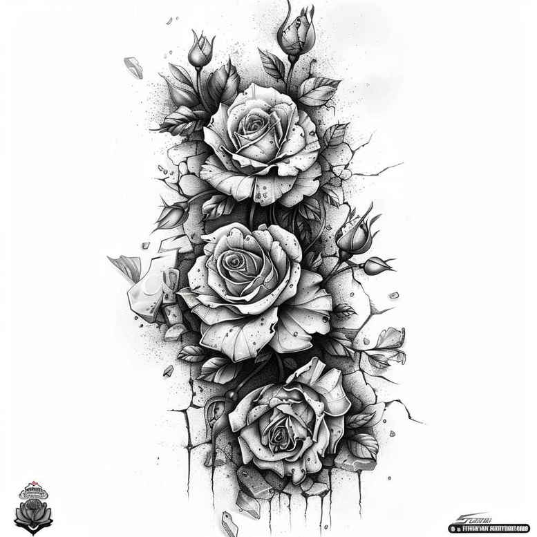 An AI-generated tattoo project presenting a black and grey floral study centered on three roses rising along a slender stem, with curling leaves and dripping ink that dissolves into negative space. Rendered in grayscale with careful shading, stippling, and fine line detailing, the piece straddles realism and decorative patterning, inviting a skilled artist to translate it into a finished body of work. The roses symbolize beauty, growth, and renewal; the trailing stem and ink drips suggest time, memory, and transformation, allowing wearers to encode personal meaning into a timeless motif. Because the design relies on strong values and layered shading, it is an excellent candidate for a cover-up, capable of concealing older tattoos beneath a cohesive new composition. The pattern-like repetition of blooms lends itself to a vertical layout that can be adapted from forearm to thigh, depending on placement, with the option to extend into a sleeve or chest piece as desired. In practice, the black and grey palette offers depth through contrast, stippling, cross-hatching, and soft gradations, while crisp outlines keep the design legible at smaller sizes. For those seeking meaningful tattoos, this rose tattoo design delivers a classic yet contemporary aesthetic. It also serves as a versatile concept for small tattoos or larger, custom tattoo design projects, with potential to incorporate lotus flower tattoo or infinity tattoo elements for symbolic extension. The style leans toward realistic black and grey, yet the pattern-driven rhythm makes it compatible with Japanese style tattoo or tribal-inspired adaptations if desired. Beyond aesthetics, the design resonates with personal narratives—romance, endurance, and memory—making it a compelling choice for anyone looking to mark a pivotal moment in ink. This concept, though AI-generated, is ready to be refined into a final tattoo that honors tradition while embracing modern boldness, a perfect fit for cover-up ambitions and for collectors seeking a durable, meaningful tattoo.