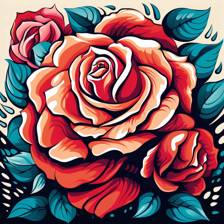 Presented as an AI-generated tattoo project, this color-forward rose design centers on a lush bloom rendered in red, coral, and peach tones, with bold black outlines that give the piece a graphic, poster-like presence. The petals unfold in layered curvature, transitioning through subtle gradient shading that suggests velvety depth while maintaining crisp contrast against a bouquet of deep teal-blue leaves. The composition relies on strong linework and saturated color to read well on skin, whether applied as a shoulder, forearm, or back piece. Though generated as an AI concept, the drawing translates readily into a custom tattoo design, with clean contours that support shading and highlights suitable for both color and black-and-grey adaptations. The rose motif carries timeless symbolism of love, devotion, and resilience, while the accompanying leaves provide structure and a natural frame that anchors the blossom in space. For those seeking meaningful tattoos, this design offers a clear rose tattoo design theme with room for personalization—scaling, orientation, and color balance can be tailored to skin tone and anatomy. Although bold, the composition remains versatile for sleeve or small-tattoo formats, preserving legibility on smaller canvases through deliberate contrast. The project showcases how a vibrant bouquet can function as a standalone tattoo or be adapted as a cover-up concept if a client wishes to conceal older work; its high-contrast palette can aid in overlaying previous ink while preserving a vibrant final impression. This concept demonstrates the potential of AI-assisted artwork in tattoo planning, inviting collaboration with a tattoo artist to refine lines, shading, and color balance, while respecting the client’s vision. In essence, the image captures the energy of contemporary floral tattoo design—classic symbolism meets modern technique, offering a robust foundation for a rose tattoo design expressed in color realism or traditional bold linework. For practitioners, the piece signals practical considerations in ink saturation, line weight, and color retention, aligning with flower tattoos and detailed botanical motifs that remain legible across body canvases.