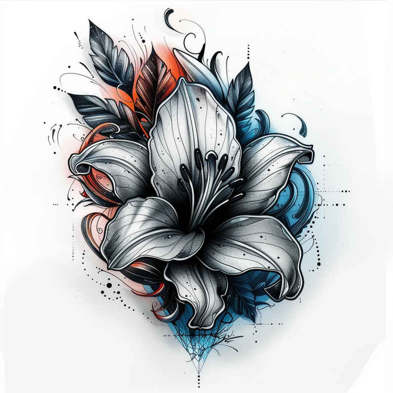 Presented as an AI-generated tattoo project, this floral composition centers on a lush blossom rendered in black and grey with restrained color accents. The core of the piece features layered petals, each defined by crisp outlines and subtle inner shading that build volume and a lifelike sense of depth without overpowering the skin. Delicate stippling and light cross-hatching texture the petals, while small flashes of orange and blue provide a contemporary counterpoint to the grayscale backbone. The arrangement is compact yet dynamic, with curling petal edges weaving around a soft central core to suggest movement and growth, making it suitable for placement on the forearm, shoulder, or chest, either as a standalone piece or as the focal element of a larger sleeve. The grayscale values are calibrated to read clearly on skin over time, and the color accents are kept deliberately restrained to preserve longevity and timelessness; this balance aligns with fine line tattoo principles and allows the design to age gracefully as a small tattoo or be expanded into a larger work. Symbolically, flowers embody renewal, beauty, and resilience, and when embedded in a black and grey palette with a touch of color, the image conveys nuanced emotion without resorting to high saturation. As a custom tattoo design, the concept nods to both traditional floral symbolism and contemporary tattoo trends, drawing inspiration from Japanese floral linework while maintaining a modern, editorial sensibility. This AI-generated tattoo project demonstrates how digital planning can translate into an ink-ready blueprint, helping artists communicate precise line weights, shading gradients, and color tweaks for a meaningful flower tattoo design that remains versatile across styles. Whether requested as a small piece or integrated with other motifs, the design offers a refined, realistic bloom that embodies craft, care, and lasting appeal.