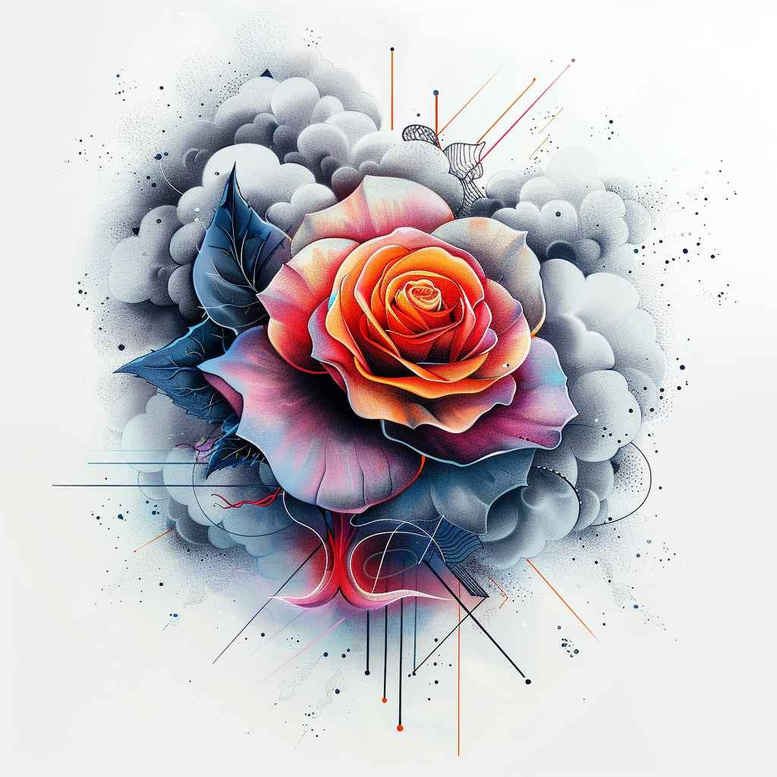 AI-generated tattoo project concept: this rose tattoo design presents a vibrant, three-dimensional bloom anchored by a cyan-blue smoky backdrop and crisp geometric line accents. The central rose displays a gradient of orange-red petals, softly shaded to create realistic depth, while the surrounding haze suggests atmosphere and movement. Intersecting straight lines and angular shards slice through the composition, lending a contemporary graphic counterpoint to the natural form. The visual balance between organic curvature and precise geometry is deliberate, enabling a dynamic focal point that reads well on the skin. The piece can be rendered in bold color for a statement piece or adapted to a fine-line treatment for subtle detail, making it versatile for small tattoos or larger sleeves. The design naturally integrates with black and grey or full-color ink depending on client preference, and the geometric pattern serves as a decorative frame that can be extended into additional motifs. This concept emphasizes rose tattoo design aesthetics, celebrating the symbolism of the rose as a symbol of love, beauty, and resilience, while the line work hints at modern tattoo styles. In terms of technique, the approach blends smooth gradient shading for the petals with crisp edge lines and a translucent, airbrushed background to create depth without overpowering the main subject. The resulting tattoo design is suitable for a variety of placements, such as the shoulder, forearm, or behind-the-ear, and can be adapted to different sizes while preserving the integrity of the pattern. As a perennial favorite, the rose remains a timeless choice among floral tattoos; when paired with the geometric elements, it offers a contemporary twist that can stand alone or anchor larger storytelling pieces. This is an AI-generated tattoo project concept, designed to explore how color, form, and line work interact to produce a striking piece of body art, while remaining faithful to the enduring appeal of the rose motif and the broader vocabulary of tattoo design, meaningfully connecting with themes found in lotus flower tattoo, infinity tattoo, tribal tattoo, and other meaningful tattoos. The concept remains adaptable to a range of styles—from Japanese style tattoo influences to classic black and grey realism—while keeping the core rose design as a versatile anchor for custom tattoo design and ink, suitable for both small tattoos and larger body art projects.