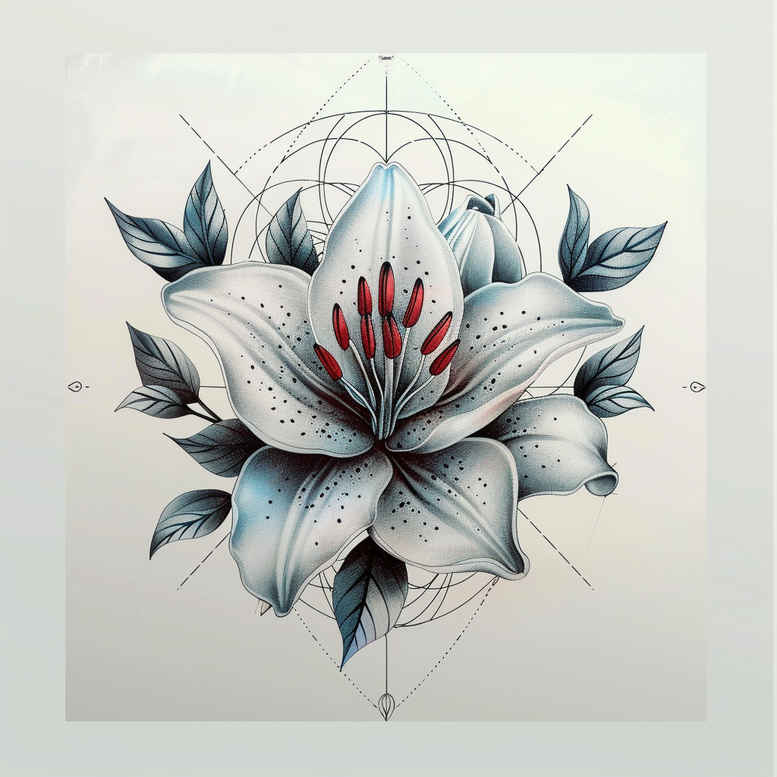 This AI-generated tattoo project presents a contemporary geometric lotus motif rendered in color, combining botanical realism with precise geometric scaffolding. The central lotus blooms with layered petals in blue-grey hues, accented by a subtle red center, while surrounding leaves frame the composition. Concentric circles, intersecting lines and arcs create a mandala-like pattern that infuses the piece with a meditative rhythm and balanced symmetry. Executed with a fine line technique, the design relies on clean, crisp lines to convey the softness of petals against the rigidity of geometry, making it suitable for both small tattoos and larger placements. The style nods to Japanese style tattoo and tribal influences while maintaining a modern, realistic tattoo sensibility. This piece functions as a meaningful tattoo design with potential for a cover-up due to its dense patterning and adaptable negative-space opportunities, should the client desire a grayscale path later. The color palette emphasizes blue-grey shading with subtle red highlights, allowing for a seamless transition into black and grey variants if grayscale is preferred, and offering versatility for future ink decisions. Symbolically, the lotus represents purity and renewal, while the interlocking geometry hints at balance, connection, and infinity—concepts often explored in infinity tattoo ideas and flower tattoos alike. For practitioners, the motif provides a robust canvas for precise line work and refined shading, aligning with fine line tattoo trends, small tattoos, and rose tattoo design sensibilities, while providing a distinctive lotus and flower identity within a custom tattoo design workflow. As an AI-generated tattoo project, it demonstrates how algorithmic design can inspire traditional ink art and serve as a strong starting point for ink artists to fuse botanical beauty with geometric symmetry into enduring body art.