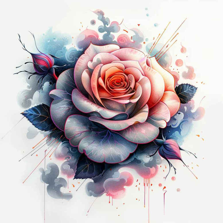 This AI-generated tattoo project concept presents a watercolor rose tattoo design rendered with luminous pink petals and blue-grey shadows, framed by dark indigo leaves and soft splashes that dissolve into negative space. The piece uses layered washes to create a luminous bloom with delicate edge work, mimicking natural petals and subtle reflections. The design emphasizes a single rose as the focal point, supported by minimal leaves and watercolor drips that add movement and spontaneity. The color palette blends warm pink with cool blue-grey tones, producing a harmonious contrast that remains readable as a tattoo on light to medium skin tones. Techniques include soft shading, feathered transitions, and controlled color bleeding to achieve a painterly look while maintaining tattoo longevity and legibility. As a tattoo design concept, it suits a range of placements and scales, from small floral accents to larger back or thigh pieces, and can be adapted to Japanese-style or traditional influences through line weight adjustments. This AI-generated tattoo project demonstrates how fine line precision can coexist with broad watercolor washes to create a modern flower tattoo design that remains timeless, meaningful, and adaptable for different styles—black and grey if scaled down, or full color for a vivid statement. The rose symbolizes love and resilience, while the flowing splashes evoke water and life, making it a versatile choice for meaningful tattoos and custom tattoo design; the work also aligns with trends in flower tattoos and small tattoos for personal expression. The piece is crafted with an eye toward versatility, enabling tattoo enthusiasts to translate this concept into custom tattoo design that honors both realism and painterly flair, and invites variations such as lotus flower tattoo or additional botanical elements for a richer narrative in body art and ink.
