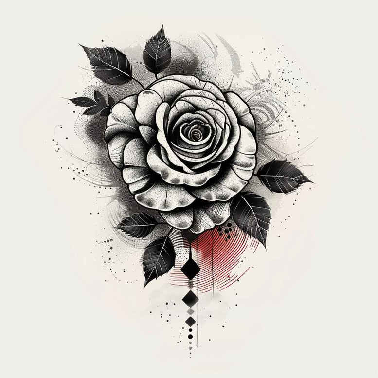 An AI-generated tattoo project presenting a black and grey rose with subtle geometric accents. The central bloom uses fine line strokes and soft gradient shading to render petals with lifelike curvature, while surrounding leaves form a restrained frame. A vertical sequence of bead-like elements and diamond shapes introduces a measured pattern that can extend into a larger panel or remain a refined forearm piece. The composition’s density—bold black areas against negative space—creates a cover-up-friendly silhouette that can obscure darker underlying ink while preserving a recognizable floral focal point. Symbolically, the rose conveys endurance and renewal, and the geometric beads imply precision and continuity, aligning with meaningful tattoos and flower tattoos alike. Practically, the design supports a custom tattoo design across placements such as forearm, upper arm, or calf, scalable from a small tattoo to a larger statement. The graphic pattern elements ensure rhythm and cohesion, enabling seamless integration with existing ink while maintaining a distinct center motif. The black and grey palette, combined with fine line technique, keeps the work timeless and versatile, with echoes of Japanese style tattoo and Western floral aesthetics. The AI-generated origin marks a new frontier in concepting, illustrating how algorithmic design can produce tattoo-ready compositions that honor classic rose imagery while offering cover-up capable solutions for darker canvases, and highlighting the evolving role of AI in tattoo design for meaningful tattoos, small tattoos, and custom tattoo design.