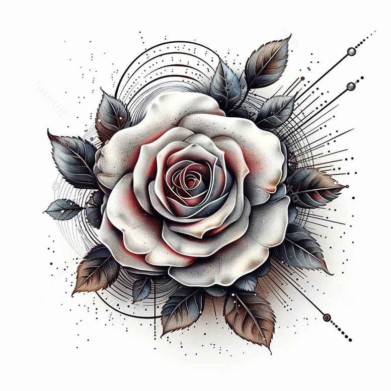 Realistic black and grey rose tattoo design rendered with delicate shading, subtle stippling, and precise linework that gives the bloom depth on skin. The centerpiece is a multi-petaled rose, its petals softly graduated from near white to graphite grey, with crisp edges to preserve clarity during aging. Surrounding leaves anchor the composition with natural texture, while fine lines and dotwork radiate outward to create a quiet geometric pattern that reads as both botanical study and tattoo design experiment. The composition relies on controlled contrast and smooth gradient transitions to achieve a lifelike look in monochrome, making it ideal for black and grey ink enthusiasts. Placement ideas include the forearm, shoulder, or upper back, with flexibility to scale and adjust density for a cover-up or a more minimal rendition. Symbolically, the rose stands for beauty, resilience, and renewal, with leaves suggesting growth and continuity; the subtle patterning hints at balance between nature and structure, aligning with themes in Japanese style tattoo and floral traditions while remaining versatile for various aesthetics. In practice, this tattoo design demonstrates how fine line and realistic black and grey techniques collaborate to yield a sophisticated piece suitable for meaningful tattoos, small tattoos, or a larger back piece, and it serves well in portfolios focused on flower tattoos, lotus flower tattoo references, or custom tattoo design concepts. Techniques include layered shading, micro-blending, crisp outlines, stippling, and measured ink flow to maintain clarity on skin, while the outward speckling adds texture without overpowering the main bloom. Note: this is an AI-generated tattoo project, illustrating how digital workflows can seed traditional ink approaches while preserving timeless appeal of well-executed tattoo art.