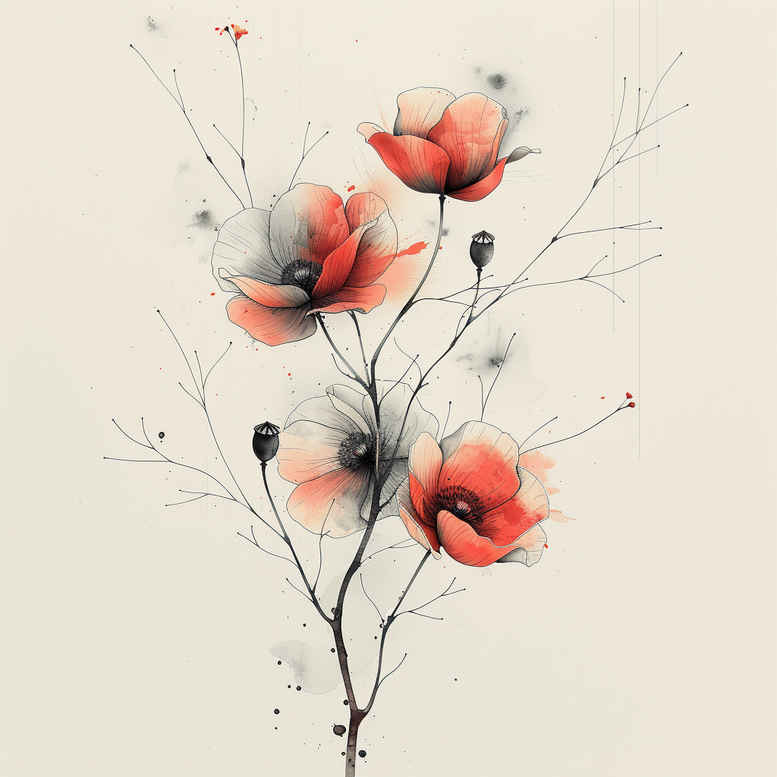An airy watercolor-inspired tattoo concept featuring red poppy blossoms along slender inked branches. The composition centers on three to four vivid blooms in crimson with deep, almost black centers, balanced by silvery-gray stems and faint wash gradients that convey movement and light. Each petal receives a soft gradient from bright scarlet to muted pink, while the centers anchor the eye, translating well in both color and black-and-grey translations. The stems are rendered with a fine-line approach: delicate, slightly imperfect, and designed to mimic real growth; surrounding negative space creates breathing room, making the design adaptable to placements from the inner forearm to the ribs. The overall effect is a refined botanical motif that reads as both realistic and painterly, suitable as a standalone tattoo or as part of a larger floral sleeve. The concept invites variations: petals could be fully colored in a Japanese-style palette with subtle sumi ink accents, or kept monochrome for a black-and-grey interpretation emphasizing line work and shading. Symbolically, poppies evoke resilience, renewal, and memory, and the arrangement of buds along a branch can suggest a journey or horizon of growth, aligning with meaningful tattoos for personal milestones. In practical terms, the design leans into a fine line tattoo aesthetic—thin stems, delicate petal outlines, and gentle color transitions that remain legible with aging ink. It also explores texture through restrained stippling and light brush-like washes that mimic natural flower surfaces. Presented as an AI-generated tattoo project, it demonstrates how digital concepting can seed a custom tattoo design for real skin, while preserving the human touch of artistry in the final ink. For clients seeking additional symbolism, the motif can be harmonized with a lotus flower tattoo or small infinity elements without overpowering the primary floral subject, producing a versatile composition that suits both small tattoos and larger, ongoing body art. This approach prioritizes a timeless botanical study, combining contemporary watercolor technique with the enduring allure of floral tattoos, and aims to inspire meaningful tattoos that resonate with personal narratives, ink quality, and long-term wearability.