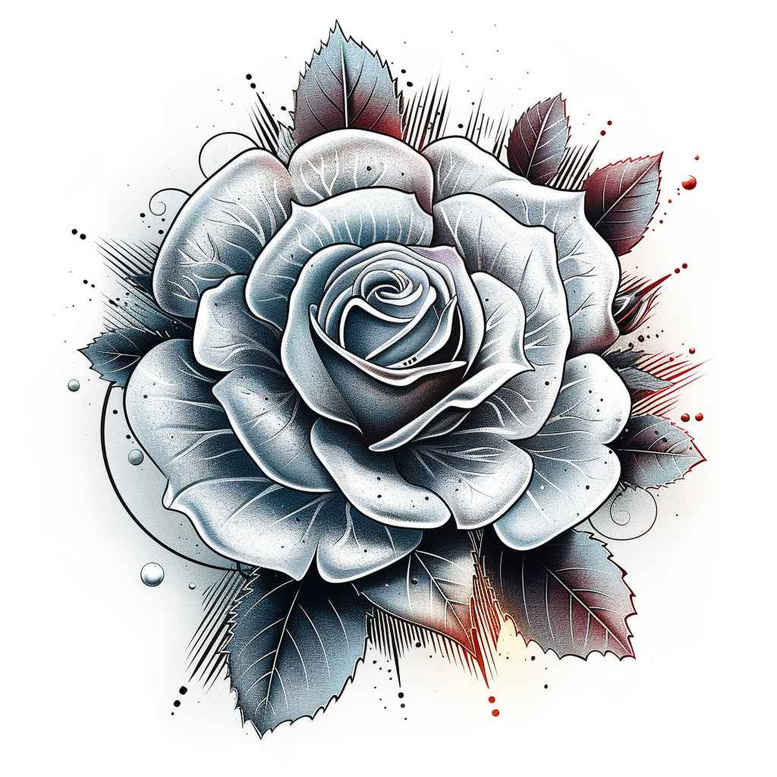 AI-generated tattoo project presents a single blue-gray rose in meticulous shading, accompanied by curling leaves and subtle color accents of red-orange watercolor splashes. Executed in a refined fine line and shading technique, the design relies on crisp contour lines, smooth gradations of gray, and selective color wash to create depth and realism. The rose is the focal point, its petals rendered with layered gradients to convey softness and dimension, while the leaves provide contrast through darker veining and lighter highlights. The interplay of black ink and blue-gray tonality yields a subdued monochrome foundation, with a contrasting splash of warmth that draws the eye toward the center of the bloom. The composition is upright, balanced, and adaptable to various canvas sizes, from the wrist to the shoulder. Technique-wise, this design demonstrates careful line weight control, gentle stippling for texture, and controlled watercolor-style blotches to suggest movement and vitality without overpowering the form. Meaningful tattoos often pair natural motifs like roses with symbolic resonances—roses commonly signify love and resilience, while leaves symbolize growth and renewal; together, they form a timeless study in beauty and endurance. This tattoo design aligns with both classic and contemporary sensibilities, suitable for those seeking a refined yet expressive piece. As a custom tattoo design, it emphasizes precision and clarity of line, ensuring legibility over time while maintaining subtle shading that translates well to black and grey as well as color-adapted sessions. Given its soft gradients and restrained color accents, the piece remains versatile for small to medium-sized placements, and could be a striking standalone motif or complement larger sleeves. Note: this is an AI-generated tattoo project exploring a blue-gray rose with watercolor accents; keywords such as fine line tattoo, realistic tattoo, and ink are integral to the concept, offering a solid foundation for a meaningful tattoo journey and a strong option for both flower tattoos and Japanese style tattoo motifs.