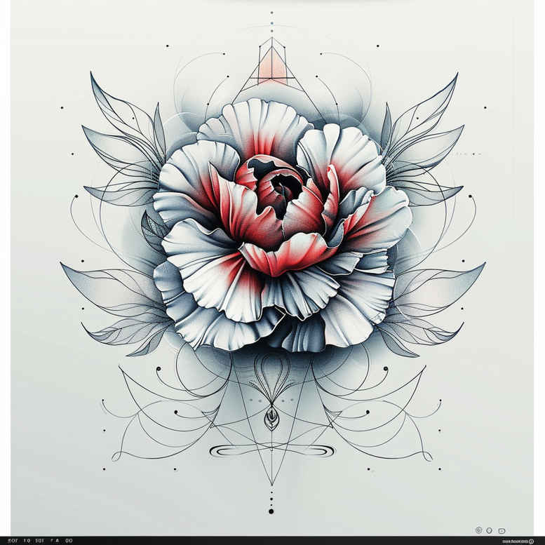 This is an AI-generated tattoo project concept featuring a central rose intertwined with lotus petals, framed by a delicate mandala grid and fine line geometry. Executed in a refined black ink baseline with subtle blue-gray shading, the composition blends organic bloom realism with architectural vector forms. The rose, rendered in soft reds with feathery highlights, sits at the heart of a ring of lotus-like petals in cool graphite tones, creating depth and balance. The mandala elements radiate outward, with geometric triangles and fine lines that anchor the floral core, lending timeless, almost sacred geometry to the design. The technique relies on precise line-work, clean edges, and careful negative space to preserve legibility as a potential tattoo design that could adapt to a shoulder, forearm, or sleeve. The overall effect is both decorative and meaningful: the rose commonly symbolizes love, resilience, and beauty, while the lotus suggests spiritual awakening and purity; together they form a meditative motif about growth and renewal. The pattern-like geometry lends a modern edge, ideal for those seeking a small-to-medium tattoo with a bold focal point yet ample room for scaling. As an AI-generated tattoo project concept, it demonstrates how classic floral motifs can be reimagined through fine line tattoo techniques, achieving a fresh yet timeless vibe that can be translated into a custom tattoo design, Japanese-influenced line work, or refined black and grey ink on skin. For enthusiasts exploring meaningful tattoos, flower tattoos, or a rose tattoo design with layered symbolism, this concept also serves well as a cover-up idea if adjustments are needed to mask previous ink; the patterning provides flexible placement and sizing options, while the composition remains legible and elegant on different body canvases, making it suitable for modern body art portfolios and ink explorations.