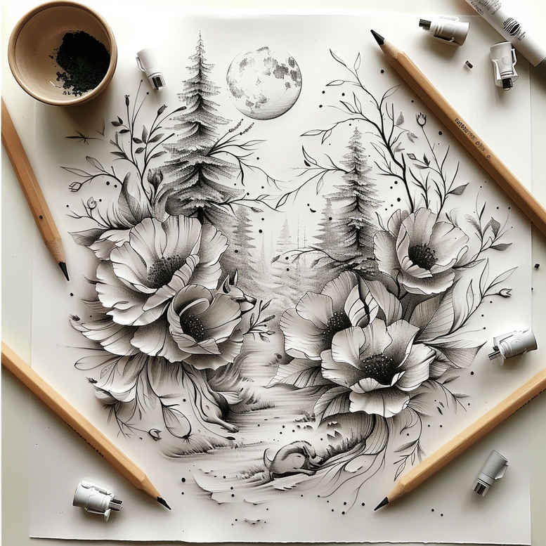 This AI-generated tattoo project presents a floral linework concept rendered in black and grey, featuring two prominent blossoms with delicate veining and soft shading. The drawing sits on a white drafting surface, surrounded by pencils, a brush, a cup of ink, and an eraser, suggesting the progression from sketch to skin. The design relies on fine line technique, precise contour, and subtle cross-hatching to create depth while keeping the lines crisp for longevity as a tattoo. The two flowers arc gracefully, their petals spilling into the surrounding negative space to evoke a sense of movement and balance; leaves weave around the blossoms to form a cohesive floral pattern that reads well at small sizes and scales up for larger canvases such as the forearm, shoulder, or back. Symbolically, flowers denote growth, renewal, and beauty, and the pairing can symbolize partnership or harmony, while the restrained black and grey palette emphasizes texture and form over color, aligning with a realistic tattoo aesthetic. For those seeking meaningful tattoos, this design offers a versatile template that can be customized—adding buds, extending vines, or integrating lotus or rose elements to deepen the narrative. It also serves as a strong candidate for a cover-up due to its dense floral layout, which can be rearranged to mask existing imagery without losing the composition’s integrity. In terms of technique, the piece exemplifies fine line tattoo artistry, Japanese style influences in line fidelity, and a modern approach to depth through careful shading and stippling, ensuring the ink age gracefully and remains legible as a small tattoo or expands into a larger piece. This concept demonstrates the evolving role of AI-generated tattoo projects in shaping contemporary body art, offering meaningful tattoos that blend traditional motifs with modern precision; it stands as a polished, customizable tattoo design ready for collaboration with a skilled tattoo artist.