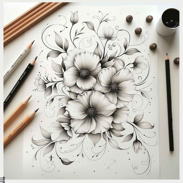 This entry presents a floral sketch tattoo design rendered in a graphite, pencil-driven technique. A bouquet of blossoms dominates the center, with layered petals, soft shading, and fine black outlines that give a naturalistic, botanical feel. Surrounding the blooms are stems and leaves that create a graceful arc across the page, balanced by negative space to allow the design to breathe on skin. The artist’s tools—pencils and a paper sheet—are depicted in the margins, underscoring this as a study or concept piece rather than a finished tattoo; the image functions as an idea for a tattoo design rather than a color work. The composition leans into a fine line aesthetic, emphasizing clean contours and delicate shading that can translate well into a black-and-grey tattoo on various skin tones. The work reads as a versatile motif that could be adapted as a small or medium-sized piece, with potential placements along the forearm, shoulder, or upper back. If you’re aiming for a meaningful tattoo, the floral subject carries timeless symbolism: blossoms as life’s fleeting beauty, leaves as growth, and a subtle rhythm that invites personal interpretation. This is an AI-generated tattoo project concept, designed to explore the elegance of monochrome florals for body art, including refined line work and subtle shading that keeps the design legible at smaller sizes. The description intentionally emphasizes a classic botanical theme with a focus on fine-line precision, black and grey shading, and the potential for customization in tattoo design contexts such as Japanese-style and floral motifs.