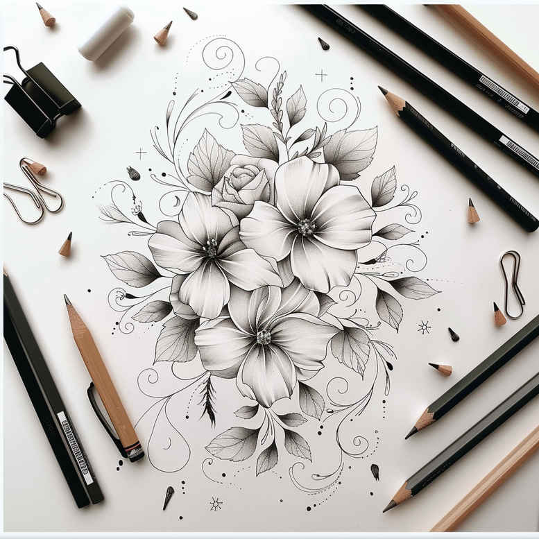 AI-generated tattoo project concept featuring a floral bouquet rendered in fine-line black-and-grey ink. The central motif unfolds as a cluster of blossoms with precise contour lines, soft shading, and restrained negative space that create depth without heavy contrast. Surrounding the blossoms are slender leaves and subtle stems, all harmonized by a balanced rhythm that translates well to skin. The composition rests on a studio scene visible in the margins—pencils, brushes, a sheet of paper, and a few clips—evoking the artisanal process behind a custom tattoo design. This botanical study demonstrates how fine-line technique can capture natural elegance while remaining durable on the skin; the line weights shift delicately to suggest volume, and the shading remains grayscale to preserve clarity over time. The petals and form can evoke lotus-like symbolism of renewal and serenity, a motif common in lotus flower tattoo design, while the orderly arrangement communicates discipline and refinement—qualities that suit small tattoo designs as well as larger floral pieces. For tattoo design applications, the piece can function as a standalone motif or be modularly adapted for a sleeve, back, or chest composition, with room for personal symbolism such as growth or memory. The black-and-grey palette makes it compatible with traditional and Japanese-style tattoo aesthetics, and the crisp line work aligns with contemporary meaningful tattoos and flower tattoo design trends. As an AI-generated tattoo project, it reflects a modern approach to botanical imagery that emphasizes precision, versatility, and timeless appeal in body art, ink, and design.
