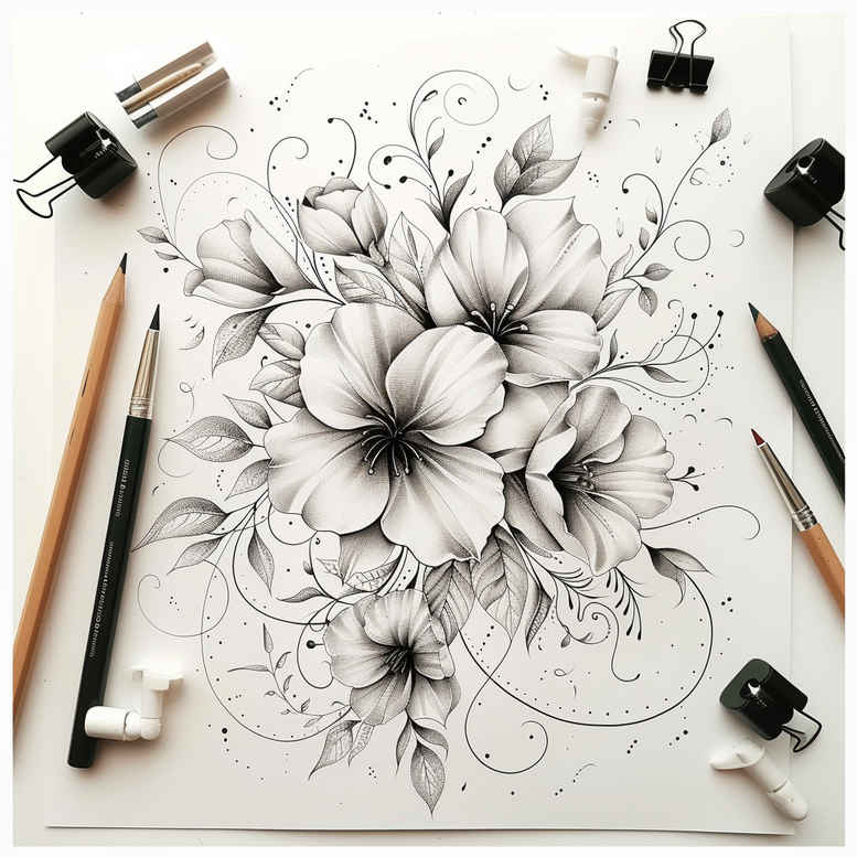 An AI-generated tattoo project concept showcasing a lush lotus flower tattoo centerpiece rendered in precise black and grey linework. The composition pairs a dominant lotus bloom with surrounding petals and slender leaves, all traced to mimic needle-and-ink shading on skin. The piece emphasizes clean contours, soft gradients, and restrained negative space to create depth and a sense of movement across the canvas. The central lotus, a lotus flower tattoo symbolizing purity, resilience, and rebirth, while curling tendrils and subtle stippling evoke growth and continuity. The sketch reads as both a standalone floral motif and a versatile design adaptable to various placements, from forearm to shoulder, offering potential as a large statement piece or a refined small tattoo with impactful presence. The approach foregrounds fine-line technique—a hallmark of delicate tattoo design—preserving subtlety while allowing the imagery to breathe on the skin. Rendered in grayscale, the drawing favors black and grey tattoo executions, delivering timeless appeal and easy integration with other motifs such as koi, cherry blossom, or tribal accents. Though presented as a line-focused concept, the artwork also serves as a canvas for color overlays if desired, but its strength lies in the interplay of light and shadow achieved through controlled shading. In terms of symbolism and intent, the lotus is a popular meaningful tattoos choice, often paired with infinity or other emblems to convey endurance and perpetual growth in both Japanese style tattoo and contemporary contexts. For clients seeking a sophisticated, meaningful tattoo design, this concept demonstrates how fine-line precision can elevate a floral motif into a refined body art piece. As an outline for a tattoo project, it accommodates the wearer’s anatomy, skin tone, and placement considerations while offering a timeless silhouette. If a cover-up is a priority, the grayscale shading and crisp lines can help mask older ink beneath with careful planning to preserve the lotus’s detail and legibility. Overall, this concept illustrates how an AI-generated tattoo project can translate botanical beauty into a versatile, high-impact design suitable for both small and larger formats, reinforcing that black and grey ink remains a classic choice for meaningful tattoos and modern, custom tattoo design.