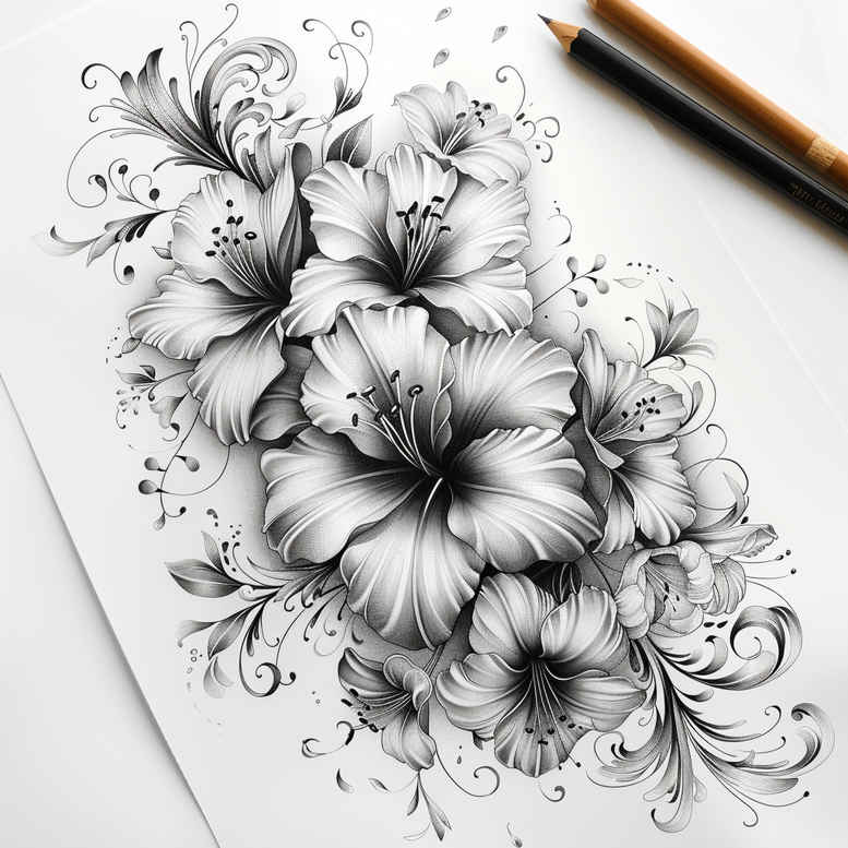 This AI-generated tattoo project concept presents a black and grey floral study derived from a pencil sketch. The composition centers on a dense bouquet of blossoms with soft shading, framed by curling leaves and delicate swirls that read as a botanical bouquet ready for skin. The pencil-line texture is intentionally preserved in translation to ink, using fine line technique and subtle gradations to evoke the tactile feel of graphite while ensuring longevity on keratin. The design reads as both a realistic floral study and a versatile template for tattooing, with clear central forms and carefully managed negative space so it can be scaled down to a small tattoo or expanded into a larger piece. The motif carries symbolic resonance: flowers symbolize growth, renewal, and resilience, while leaves frame the blossoms as an organic boundary that guides the eye along the arm, shoulder blade, or side body. The black and grey palette makes it compatible with a range of skin tones and placements, and it adapts to Japanese style tattoo, traditional floral tattoo, or modern fine line tattoo directions depending on line weight and shading choices. For meaning tattoos, this concept supports personal narratives such as transformation or remembrance. As an AI-generated tattoo project, it demonstrates how a botanical bouquet can be realized in ink with careful line work and shading; it also invites customization for cover-up options if needed, thanks to its dense core and adaptable margins.