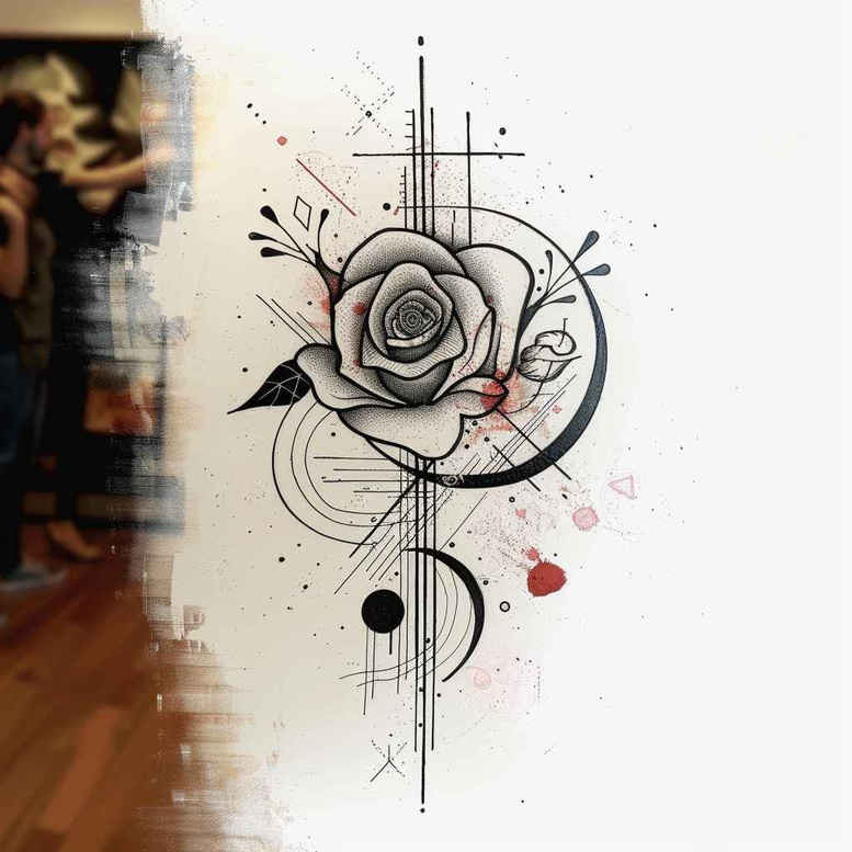 AI-generated tattoo project concept presenting a geometric rose composed of a central blooming rose rendered in black and grey, surrounded by concentric circles, intersecting lines, and orbiting orbs. The design blends floral realism with abstract geometry, a hallmark of modern tattoo design. The rose is shaded with grayscale gradients to convey depth, while fine line geometry—circles, crosshairs, and radial shafts—adds precision and rhythm. Small red accents appear as petal hints, providing a restrained pop against the monochrome ink. This concept suits meaningful tattoos that symbolize growth, cycles, and focus, and it can be executed as a fine line tattoo on the forearm, wrist, or calf. For cover-up projects, the layered geometry can help obscure older ink while reworking the composition into a cohesive new piece. The composition combines a classic rose motif with pattern-driven geometry, reflecting both Japanese style tattoo line work and Western geometric trends. It supports a range of placements from small tattoos to medium-sized body art, and the clean black and grey palette ensures longevity of line integrity. This is an AI-generated tattoo project concept; it demonstrates how a rose tattoo design can be augmented with circles and lines to yield a timeless, meaningful tattoo. It also nods to broader tattoo motifs such as lotus flower tattoo symbolism, infinity tattoo themes, and tribal tattoo aesthetics, while remaining firmly rooted in a rose tattoo design ethos and offering options for custom tattoo design, ink quality, and versatile Japanese style tattoo influences.