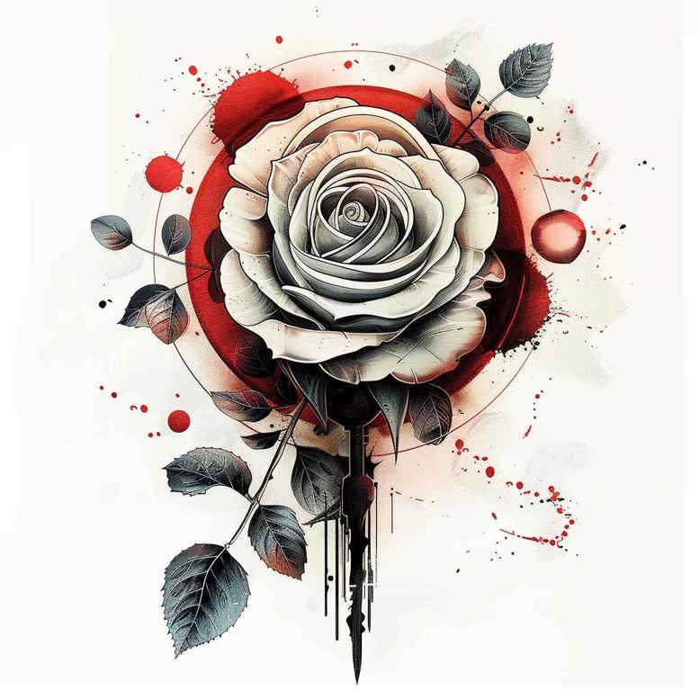 An evocative concept for a tattoo design centered on a single rose rendered in grayscale watercolor style. The petals are shaded with meticulous black and grey tonalities and fine-line detailing to convey soft curvature and depth, while subtle red ink splashes anchor the composition and suggest motion or passion. A black cascade drip extends from the base of the bloom, creating a contemporary edge that contrasts with the organic form and lends itself to meaningful tattoos about transformation. The leaves are rendered in cool grey, providing a natural counterpoint to the luminous bloom and helping the piece read as a cohesive body art design. Executed as a custom tattoo design concept, the approach blends classic rose symbolism—love, memory, renewal—with a painterly technique that suits both small tattoos on the wrist or behind the ear and larger sleeves when expanded. The grayscale palette ensures compatibility with black and grey ink, while the red accents offer a focal point without overpowering the composition. The technique leans toward watercolor-inspired shading, with soft edges and deliberate splatters suggesting spontaneity, yet the arrangement remains balanced and legible over time. For color enthusiasts, the concept can be adapted to full color; for those seeking a meaningful tattoo with subtlety and longevity, this design offers a refined option. In terms of symbolism, the rose embodies enduring love and resilience, the drip hints at gravity or loss, and the monochrome base is a timeless choice. This concept aligns with trends in fine line tattoo and realistic tattoo aesthetics, while remaining suitable for a wide range of placements, including forearms, collarbone, or ribs. As an AI-generated tattoo project, the concept demonstrates how a simple floral topic can be elevated through painterly experimentation and precise line work; the result is a modern bouquet that can anchor a larger body art narrative or stand alone as a striking piece of ink.