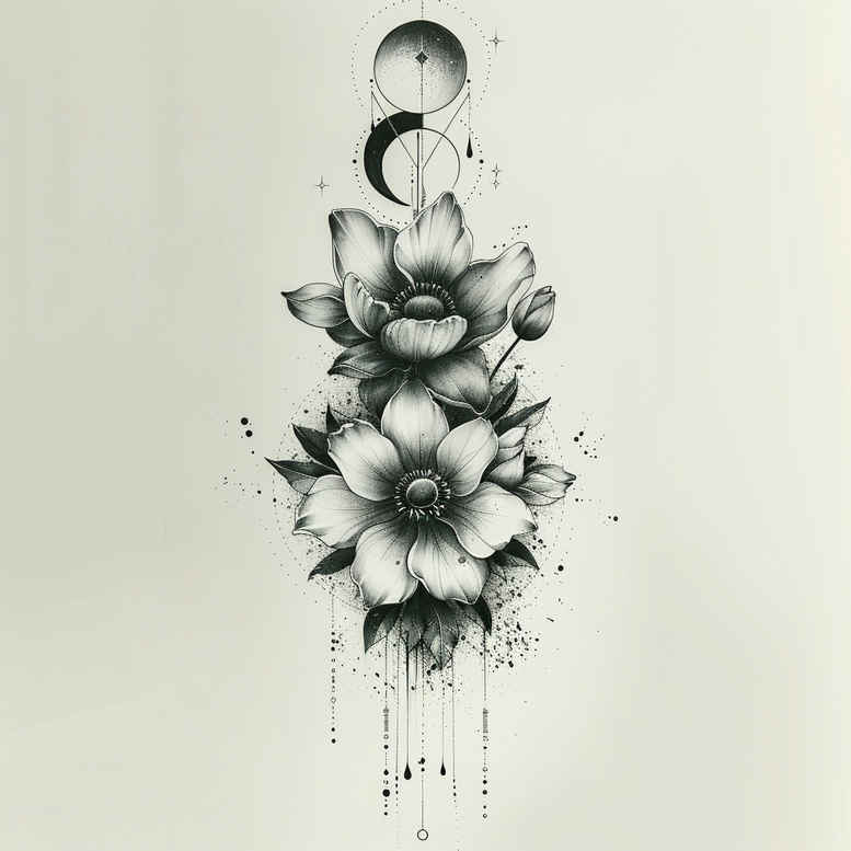 Presented here is a refined black and grey composition centered on a lotus flower arrangement with a slender stem, crowned by a crescent moon. Executed in a precise fine-line technique, the design relies on clean outlines, soft grayscale shading, and restrained negative space to render petals with subtle texture and quiet depth. The lotus motif stands for purity, resilience, and renewal, while the crescent moon introduces celestial symbolism—cycles, intuition, and transformation—resulting in a balanced, contemplative narrative that can be read as a personal alchemy. The vertical rhythm of blossoms and stems lends itself to placement along the forearm, inner arm, ribs, or calf, and the elongated form can be tuned for a cover-up by adjusting density, spacing, and contrast. Gentle ink splashes and light drips impart a contemporary edge, giving the piece a modern feel without sacrificing legibility or longevity of the line work. This is an AI-generated tattoo project concept, offered as a starting point for client-driven customization; an experienced artist can adapt scale, line weight, and shading to suit skin tone and placement while preserving the core motif and its quiet elegance. In market terms, the design sits within black and grey tattoo design territory and aligns with small to medium flower tattoos, lotus flower tattoos, and Japanese-style influences, with broad applicability across body art. Whether realized as a standalone piece or expanded into a larger composition, the concept promises a timeless, meaningful option for meaningful tattoos, personal symbolism, and tasteful garden-like body art.