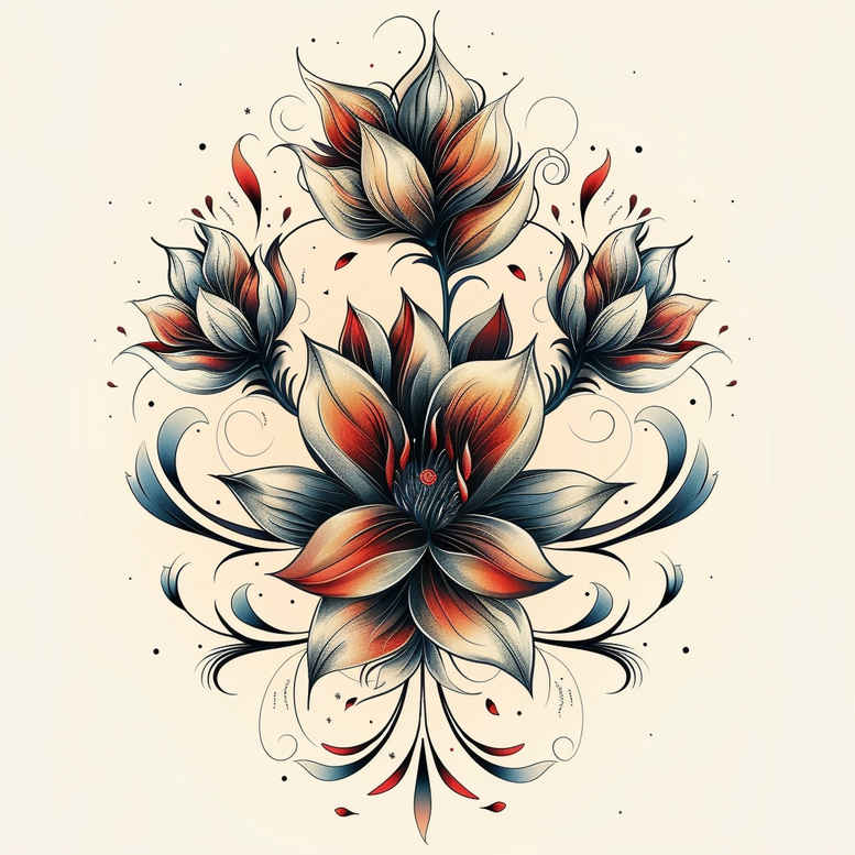 An AI-generated tattoo project concept featuring a symmetric floral mandala built from lotus-inspired petals. The piece relies on fine-line technique with crisp black outlines and subtle shading, while a vivid color palette of red, teal and burnt orange injects full color energy into the design. The lotus motif symbolizes purity and spiritual awakening, and the mandala radiates balance and infinity, aligning with themes often explored in tattoo design. The composition reads as a pattern, with layered petals expanding outward in a controlled rhythm that works as a standalone piece or as a cover-up concept for existing ink. The central bloom unfolds into multiple tiers, creating depth and movement that adapts to forearm, shoulder, or back placements, and can be scaled for small tattoos without losing the design’s integrity. While influenced by Japanese style tattoo linework and traditional floral symbolism, the work remains versatile enough for black and grey realism or bold full-color interpretations, depending on client preference. This concept embraces meaningful tattoos and the broad family of flower tattoos, including lotus flower tattoo and rose tattoo design motifs, and serves as a custom tattoo design framework that artists can tailor to skin tone and canvas. As an AI-generated tattoo project, it demonstrates how modern tattoo aesthetics fuse pattern-driven ornament with symbolic depth, inviting experimentation with ink, line density, color blocking, and surface texture to craft a refined body art piece that can be adjusted to personal narratives and meanings. The ink distribution favors thin lines with gentle shading for a breathable finish, while color fills can be adjusted to preserve legibility on different skin tones and lighting. This concept invites collaboration between artist and client to sharpen motif emphasis, whether as a small wrist piece within a larger sleeve concept or a bold back piece.