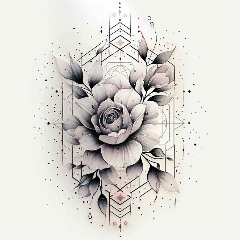 AI-generated tattoo project concept in black and grey, pairing a detailed rose with a geometric frame. The central bloom is rendered with layered petals, subtle gradations of shading, and fine line edges to convey a lifelike yet stylized flower, a hallmark of the rose tattoo design. Encasing the rose, a constellation of diamonds and interlocking lines forms a modern mandala-like matrix, enhanced by stippling that adds texture without overpowering the form, creating ink that reads cleanly in black and grey. The composition balances natural anatomy with architectural geometry, yielding a tattoo design that works on small tattoos or larger pieces and reads clearly at both close inspection and distance, suitable for placements on forearm, calf, or shoulder. Visible elements include the rose, leaves, geometry, and a stippled backdrop that dissolves into negative space, with a nod to Japanese style tattoo language and a contemporary black and grey palette. The symbolism blends floral motifs with geometric pattern work, suggesting growth within structure, harmony, and resilience—an ideal meaningful tattoo concept for those seeking personal narrative through ink. As an AI-generated tattoo project concept, it demonstrates how botanical motifs can fuse with geometric patterning to create versatile tattoo design options, including lotus flower tattoo symbolism, infinity tattoo ideas, and tribal tattoo influences. The design is scalable and customizable, suitable for small tattoos or larger body art, with adjustable line weight, shading, and the potential to weave in additional flower elements to suit individual taste. In essence, this black and grey rose with geometry exemplifies refined body art and timeless ink, making it a strong candidate for a sophisticated tattoo collection.