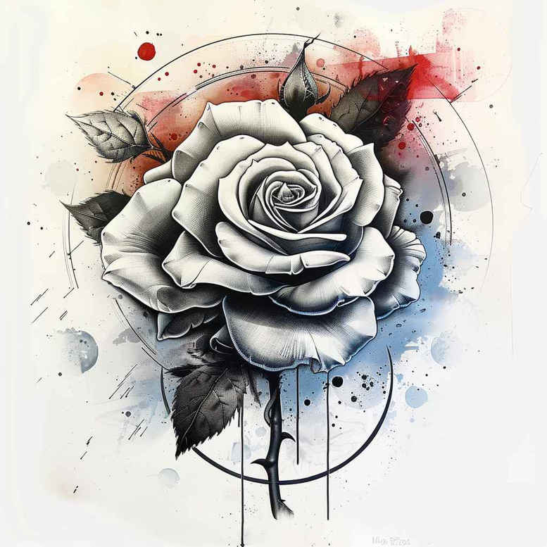 This AI-generated tattoo project concept presents a botanical rose rendered in grayscale, with fine line contours and soft shading that yield a realistic yet graphic look. A circular ring behind the bloom anchors the composition, while two leaves extend along the stem to introduce natural geometry and balance. The piece is intentionally adaptable: it reads well as a small tattoo on the wrist or ankle, yet scales gracefully toward a larger body art piece if the client desires more detail. Blue and red watercolor splashes infuse the design with kinetic color that contrasts the black and grey core, a hallmark of watercolor tattoo techniques that preserve readability of form while injecting artistic spontaneity. The approach straddles traditional rose tattoo design and contemporary watercolor aesthetics, offering a versatile custom tattoo design that can function in both black and grey and color-forward executions. In practice, a tattoo artist could adjust line weight to emphasize petals, refine the shading to enhance depth, and control watercolor saturation to suit skin tone and placement. The symbolism remains classic: the rose connotes love, renewal, and resilience, while the circle behind it suggests wholeness and continuity, making the motif suitable for meaningful tattoos. For those seeking small tattoos or flower tattoos, this concept aligns with fine line tattoo sensibilities and can be adapted into Japanese style tattoo motifs through restrained geometry and careful black ink work, or realized as a realistic tattoo with subtle ink gradients. As a digital concept, this represents an AI-generated tattoo project that bridges design software and traditional inking, illustrating how modern design processes can inform tattoo artistry without compromising the craft. The result is an elegant, timeless rose tattoo design that can be inked as a standalone piece or integrated into a larger botanical sleeve, combining classic symbolism with contemporary color and technique.