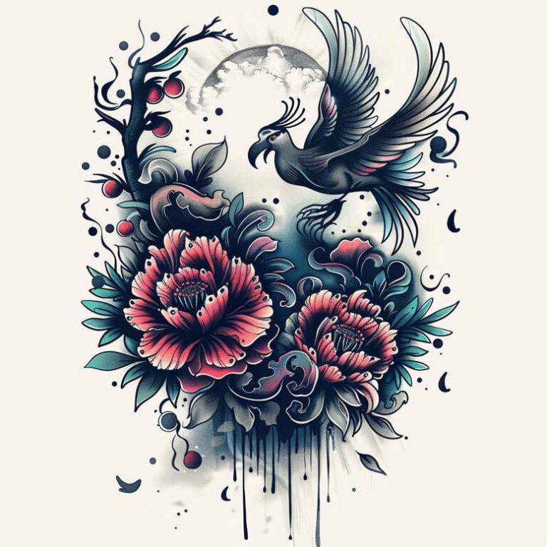 AI-generated tattoo project concept presented as a cohesive watercolor study: a luminous bouquet of roses intertwined with a sinuous swallow, rendered in pinks, blues, and smoky blacks with soft bleeding edges and ink-drip accents. The composition centers on two large roses in full bloom, their petals opening toward a swift bird in flight, while curling leaves frame the scene. The watercolor technique yields feathered gradients and subtle transitions between color zones, producing a dreamlike, organic feel suitable for a variety of placements. This design blends floral symbolism—roses representing love, passion, and resilience—with avian motion suggesting freedom and progress. The black ink provides definition and contrast, while the color washes inject life and mood. The piece leans toward a cover-up-friendly approach: the dense darkness and layered shading can be positioned to mask prior tattoos, and the fluid edges enable seamless blending with surrounding skin. The graphic patterns are expressed through splatter and ornamental motifs that contribute texture without overpowering the subject, creating a pattern-rich yet cohesive body art concept. This tattoo design lends itself to customization: scale, line weight, and color emphasis can be adjusted to suit individual anatomy and skin tone. As an AI-generated tattoo project, it demonstrates a modern approach to meaningful tattoos, combining a fine line sensibility with bold watercolor strokes. It works well as a small tattoo or a larger piece across the shoulder, back, or ribcage, and it remains anchored in the classic rose tattoo design while embracing a contemporary, realistic tattoo feel. In short, this is a detailed, color-forward concept that marries floral beauty with avian motion, a strong candidate for a custom tattoo design, and an expressive option for those seeking a black and grey base with vivid color highlights, or a full-color interpretation depending on preference. The piece emphasizes iconic imagery—flower tattoos, rose tattoo design, and a swallow motif—while inviting personalization and narrative resonance through ink. It is presented as an AI-generated tattoo project.
