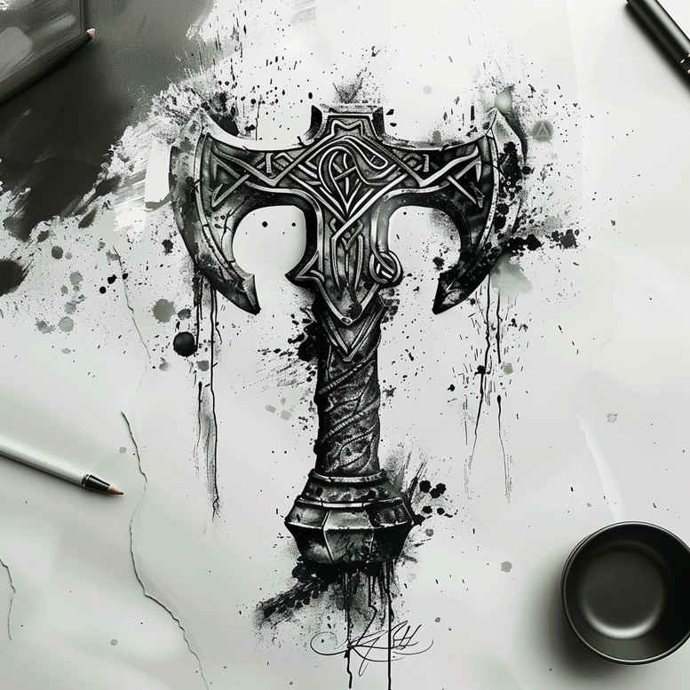 AI-generated tattoo project inspired by Norse myth, this dark, high-contrast concept centers on Mjolnir (Thor’s hammer) adorned with intricate knotwork rendered in black and grey. The hammer head carries interlacing loops that create a radial pattern across its surface, while the haft remains solid and straight to anchor the composition. Surrounding splatters and soft shading give the piece a dynamic edge, suggesting motion and energy without compromising the precision of the fine line work. The design blends traditional knotwork with contemporary tattoo aesthetics, making it adaptable for a forearm sleeve, chest panel, or bold back piece. Symbolically, Mjolnir stands for protection, strength, and divine authority, and the knotwork reinforces a sense of continuity and interconnected fate. The black and grey palette ensures bold readability on most skin tones, and the negative space around the patterns enhances the crispness of each line. The overall balance between dense black areas and slender lines is crafted to maintain clarity as a stand-alone tattoo and to support a cover-up where previous ink exists; this is especially relevant given the strong contrast and pattern density. As an AI-generated tattoo project, it demonstrates how algorithmic concepts can yield a high-quality, reusable design that translates well into a custom tattoo design brief. In practical terms, the piece emphasizes fine line tattoo technique, precise linework, and careful shading to preserve legibility over time. Visually, it pairs with other black and grey motifs or can serve as a bold centerpiece on its own, inviting additional motifs like lotus flower tattoo or rose tattoo design in a broader Japanese style tattoo or tribal tattoo scene. The concept also plays with infinity tattoo and flower tattoos as complementary ideas for a cohesive sleeve, or it can stand alone as a compact, small tattoos piece. This tattoo design is intended as a meaningful tattoo concept for body art enthusiasts seeking timeless symbolism; it also hints at how an AI-assisted approach can guide custom tattoo design while maintaining artistic integrity, making it suitable for a cover-up if desired.