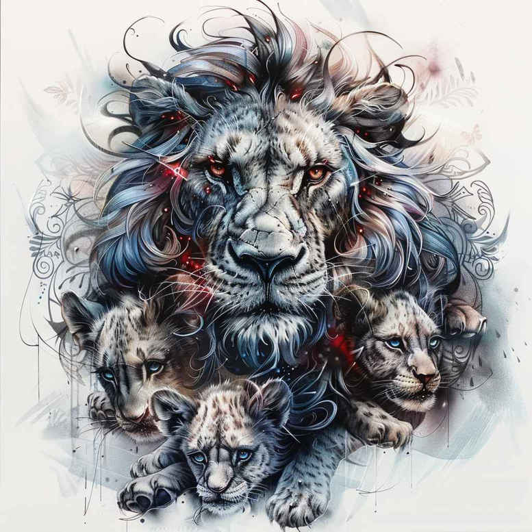 A multi-figure lion portrait forms the centerpiece, built from interwoven animal profiles that create a dynamic mane. The composition blends graphic linework with soft shading to achieve a refined realism, the fur texture conveyed through delicate fine-line detailing and subtle grey washes. A cool color palette with blue accents contrasts against black ink, while white highlights add depth and brightness. The design reads as a pattern-rich tattoo design: the central lion anchors the piece as surrounding silhouettes provide rhythm and movement across the canvas. Executed in black and grey with restrained color, the artwork is well suited for large formats on the back, chest, or sleeve, and also functions as an effective cover-up after careful planning. The piece carries meaningful tattoos potential: the lion evokes courage and leadership, while the interlaced forms symbolize unity and the interconnectedness of life, a theme that translates well into small tattoos or as a larger statement piece. The technique bridges influences from Japanese style tattoo’s clean line logic and modern graphic portraiture, delivering a bold yet sophisticated body art image. This is an AI-generated tattoo project illustrating how digital layouts can inform a custom tattoo design, offering a template for tattooers to adapt into a final piece. The dense arrangement of faces serves as a strong foundation for cover-up considerations, as negative space and shading can be tuned to conceal or blend existing tattoos, the result a distinctive, meaningful tattoo exploration that spans ink, body art, and the evolving language of multi-figure composition. Elements like lotus flower tattoo, infinity tattoo, rose tattoo design, and floral motifs can be infused as accents in a commissioned version, expanding its adaptability for various styles while keeping the core lion collage intact.
